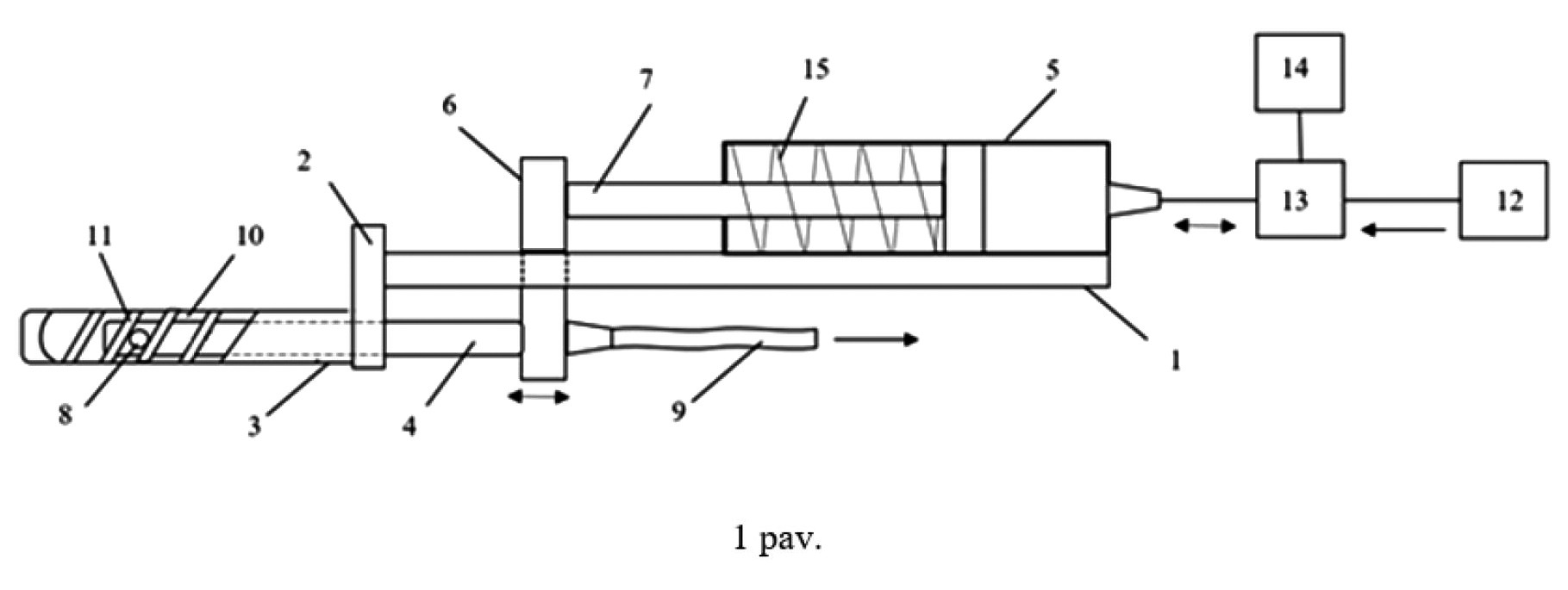 [0021] Riebalų nusiurbimo įrenginys apima korpusą (1), kronšteiną (2), kuriuo prie korpuso (1) yra tvirtinamas antgalis (3), kaniulę (4), kuri yra patalpinta antgalyje (3), slenkamajam-grįžtamajam judesiui atlikti, pneumatinės pavaros pagalba. Įrenginys taip pat apima pneumatinę pavarą (5), pavyzdžiui medicininį, didelio tūrio (100–150 ml), vienkartinį švirkštą, kurio cilindras yra pritvirtintas prie korpuso (1), o kaniulės (4) vienas galas, kronšteinu (6) yra sujungtas su pneumatinės pavaros stūmokliu (7), kuris kaniulei (4) suteikia slenkamąjį-grįžtamąjį judesį, antgalio (3) viduje. Kaniulės (4) šoniniame paviršiuje, toje dalyje, kuri patalpinta antgalyje (3), yra padaryta viena arba daugiau kiaurymių (8), per kurias riebalinis audinys, vakuumo pagalba, gali būti siurbiamas per žarną (9), į tam skirtą talpą (brėžinyje neparodyta). Ši žarna (9) yra prijungta prie kaniulės (4) galo, priešingo galui, kuris yra įvestas į antgalį (3). Prie žarnos prijungtas kaniulės galas yra sujungtas su pneumatinės pavaros (5) stūmokliu (7). Antgalio (3) šoniniame paviršiuje yra suformuoti plyšiai (10) su įžambiomis pertvaromis (11) tarp minėtų plyšių (10). Pertvaros (11) padidina antgalio (3) standumą lenkimo apkrovoms ir pagerina siurbiamo riebalinio audinio patekimą prie kaniulės (4) bei jo smulkinimą. Kaniulės (4) slenkamajam-grįžtamajam judesiui sužadinti, į pneumatinės pavaros cilindrą (5), per slėgio valdiklį (12) ir oro skirstytuvą (13) su dažnio generatoriumi (14) yra paduodamas kintamo slėgio oras, kuris švirkšto stūmokliui (7) suteikia judesį į vieną pusę, o atgal, slėgiui sumažėjus, stūmoklį (7) gražina prie jo prijungta spyruoklė (15). Tokiu būdu stūmoklio (7) poslinkio, o tuo pačiu ir kaniulės (4) slenkamojo-grįžtamojo judesio, amplitudė yra valdoma keičiant paduodamo į švirkštą oro slėgio valdikliu (12), o kaniulės slenkamojo-grįžtamojo judesio dažnis yra reguliuojamas dažnio generatoriumi (14), kuris valdo oro skirstytuvą (13).
