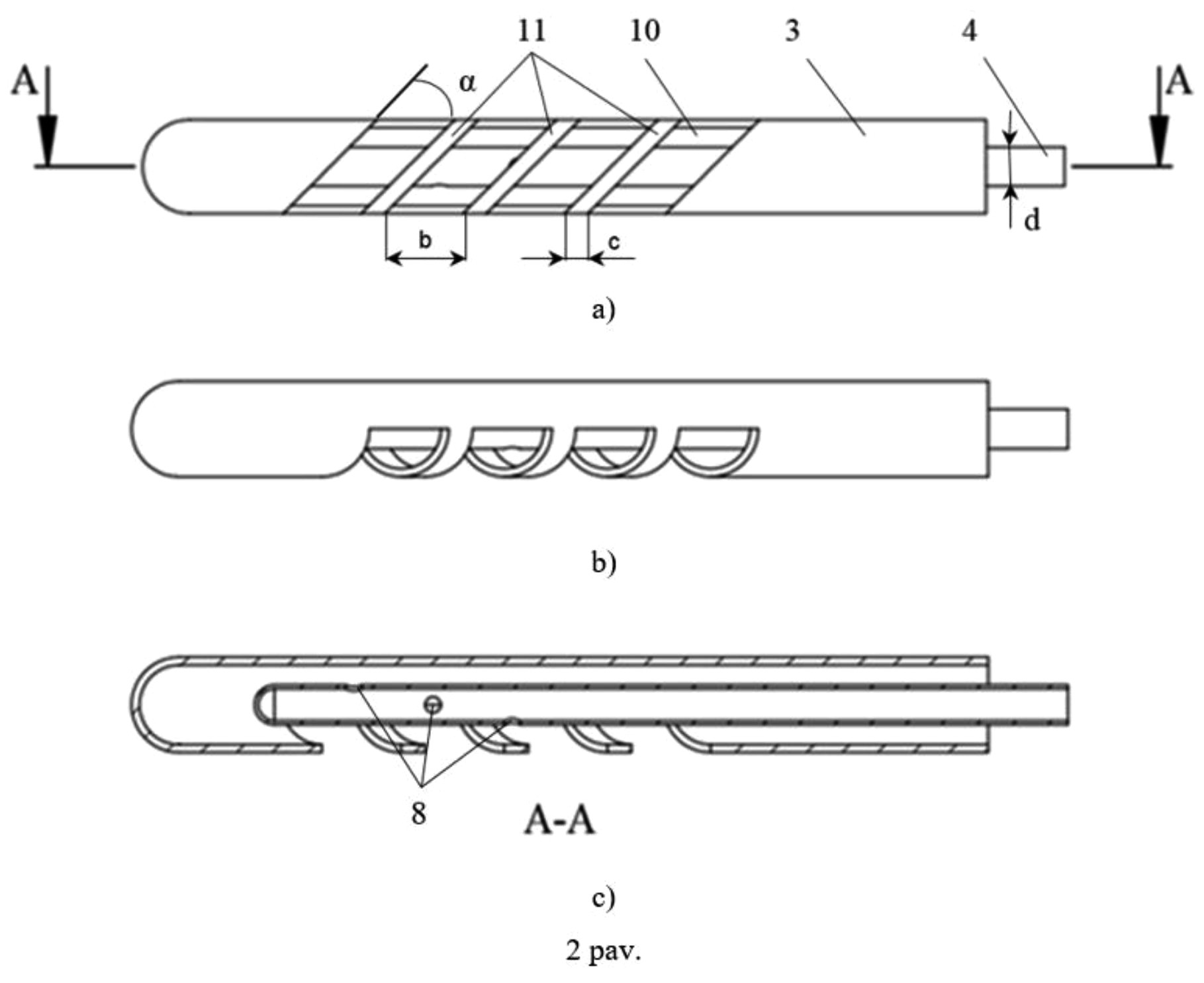[0023] Plyšių ir pertvarų pasvirimo kampas α, nuo antgalio (3) laisvo priekio, yra 30–45 laipsnių.