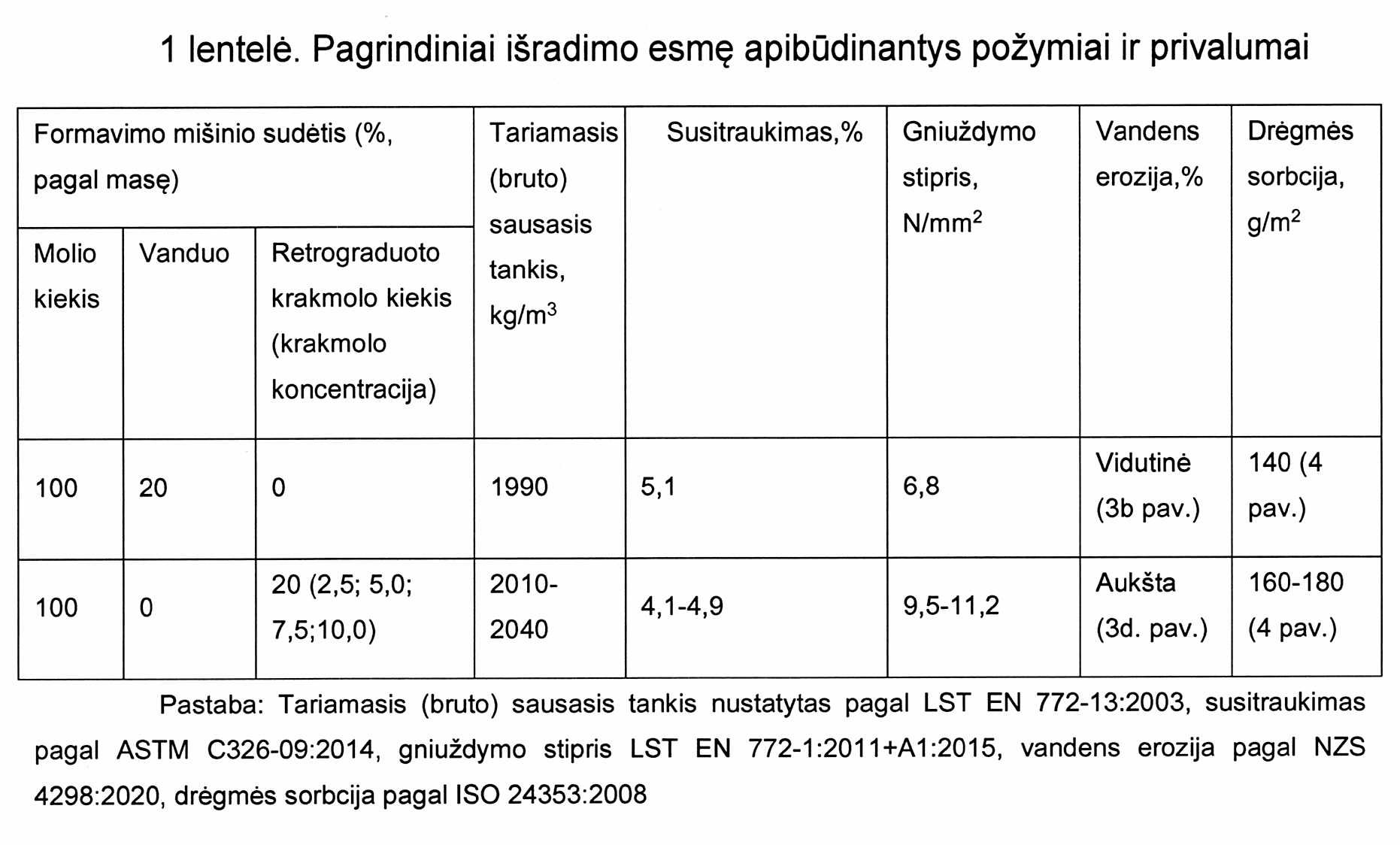 [0008] Patente US 6656994 B1 aprašomos statybinės medžiagos, kurių pagrindą sudaro molis, gamyba. Autoriai siūlo molio medžiagų gamyboje, kaip papildomus priedus nuo bendros priedų masės, naudoti vandenyje disperguojamo kopolimero (40-99 % pagal masę) ir alkoksilinto emulsiklio (0,5–10 % pagal masę) priedus. Molis turi būti išdžiovintas 120 °C temperatūroje 24 val. Gaunamų medžiagų gniuždymo stipris svyruoja nuo 0,9 MPa iki 16,2 MPa, lenkimo stipris yra 0,3–7 MPa ribose, susitraukimas 1–4 mm/m. Atsparumas vandeniui buvo nustatytas laikant 6 dienas 20 °C temperatūroje, vėliau buvo tikrinami gaminiai ar nesuminkštėjo, sutrupėjo ir pan. Buvo nustatyta, kad priklausomai nuo priedų kiekio, atsparumas vandeniui gali būti nuo labai gero (1 skalė, pagal autoriaus patentą) iki labai blogo (6 skalė, pagal autoriaus patentą).