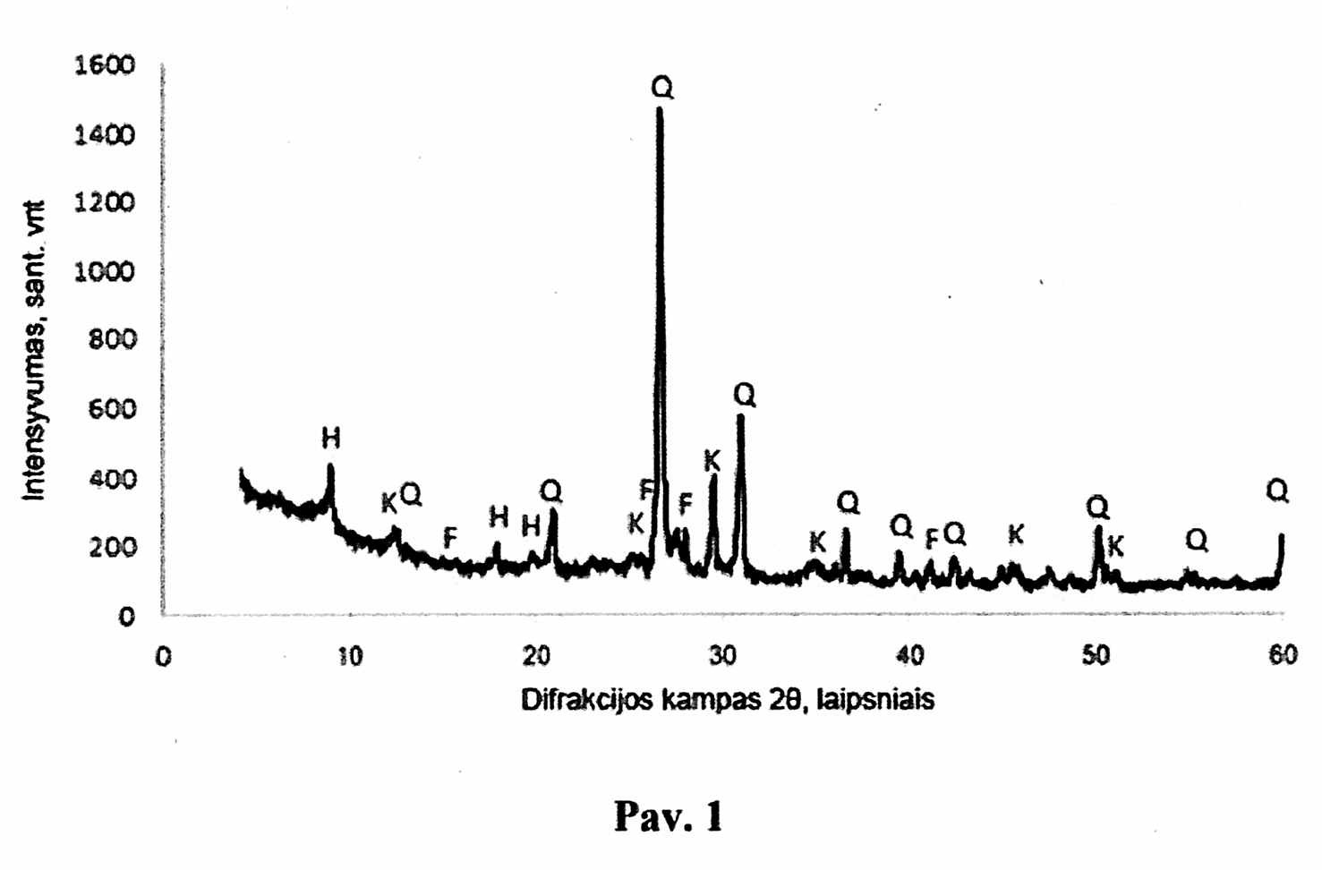 [0022] 1 pav. Molio mineraloginė sudėtis (H – hidrožėrutis, Q – kvarcas, K – kaolinitas, Ls – lauko špatai).
