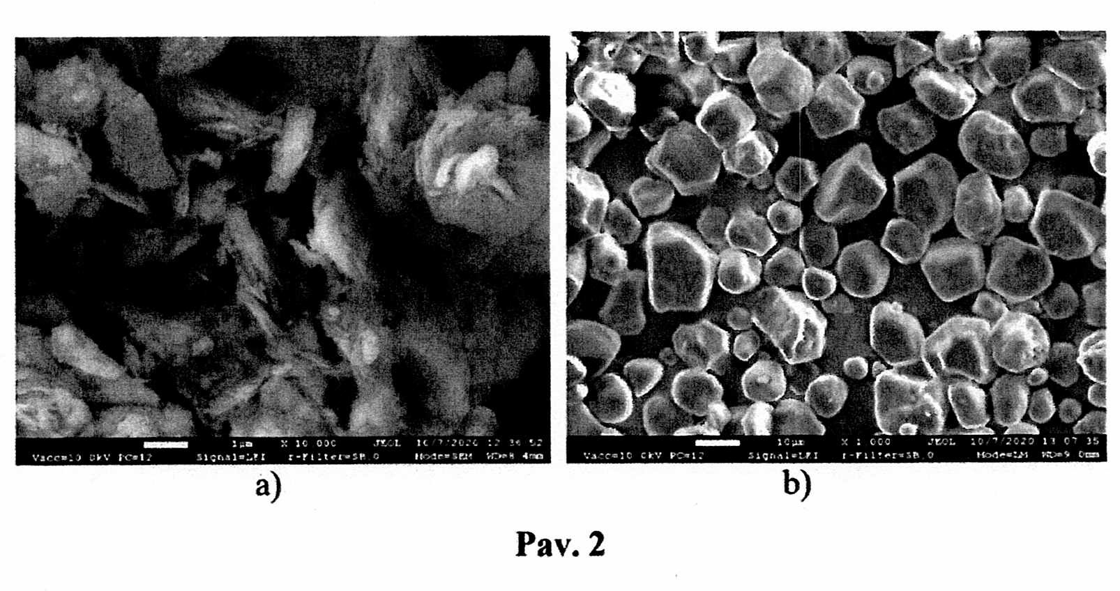 [0014] Naudoto molio cheminė sudėtis (%) yra tokia: 48,76 – SiO2, 17,43 – Al2O3, 5,53– Fe2O3, 9,87 – CaO, 4,57 – MgO, 2,24 – K2O, 0,42 – Na2O, 11,18 – kaitmenys. Nustatyti molio mineralai yra H – hidrožėrutis, Q – kvarcas, K – kaolinitas, Ls – lauko špatai (1 pav.). Molio plastiškumo indeksas 18. Naudojamas biopolimeras (kukurūzų krakmolas) sudarytas iš dviejų tipų α-gliukano, 62,6 % amilopektino ir 26 % amilozės. Molio žėručio sluoksnių labai daug molio struktūroje, jie yra maždaug 0,5–1,5 µm dydžio (2 a pav.), visos krakmolo dalelės yra mažesnės nei 10–12 μm, krakmolo dalelių forma yra sferinė, dalelių paviršius lygus (2b pav. 2).