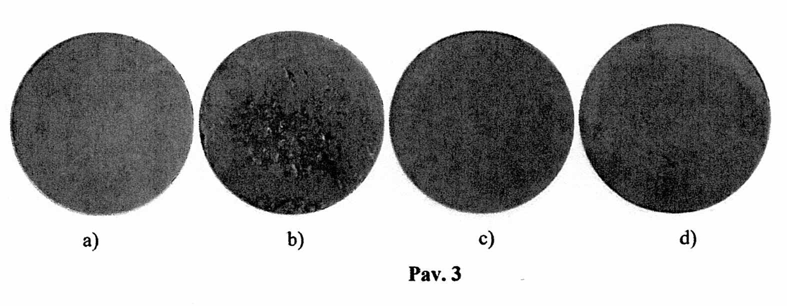 [0024] 3. pav. Nedegto molio bandiniai prieš ir po vandens erozijos bandymo: a) nedegto molio su 20 % vandens kiekiu (pagal masę) gaminys prieš bandymą; b) nedegto molio su 20 % vandens kiekiu (pagal masę) gaminys po bandymo; c) nedegto molio su 20 % (2,5 % krakmolo koncentracija) retrograduoto krakmolo hidrogelio kiekiu gaminys prieš bandymą; d) nedegto gaminys po bandymo).