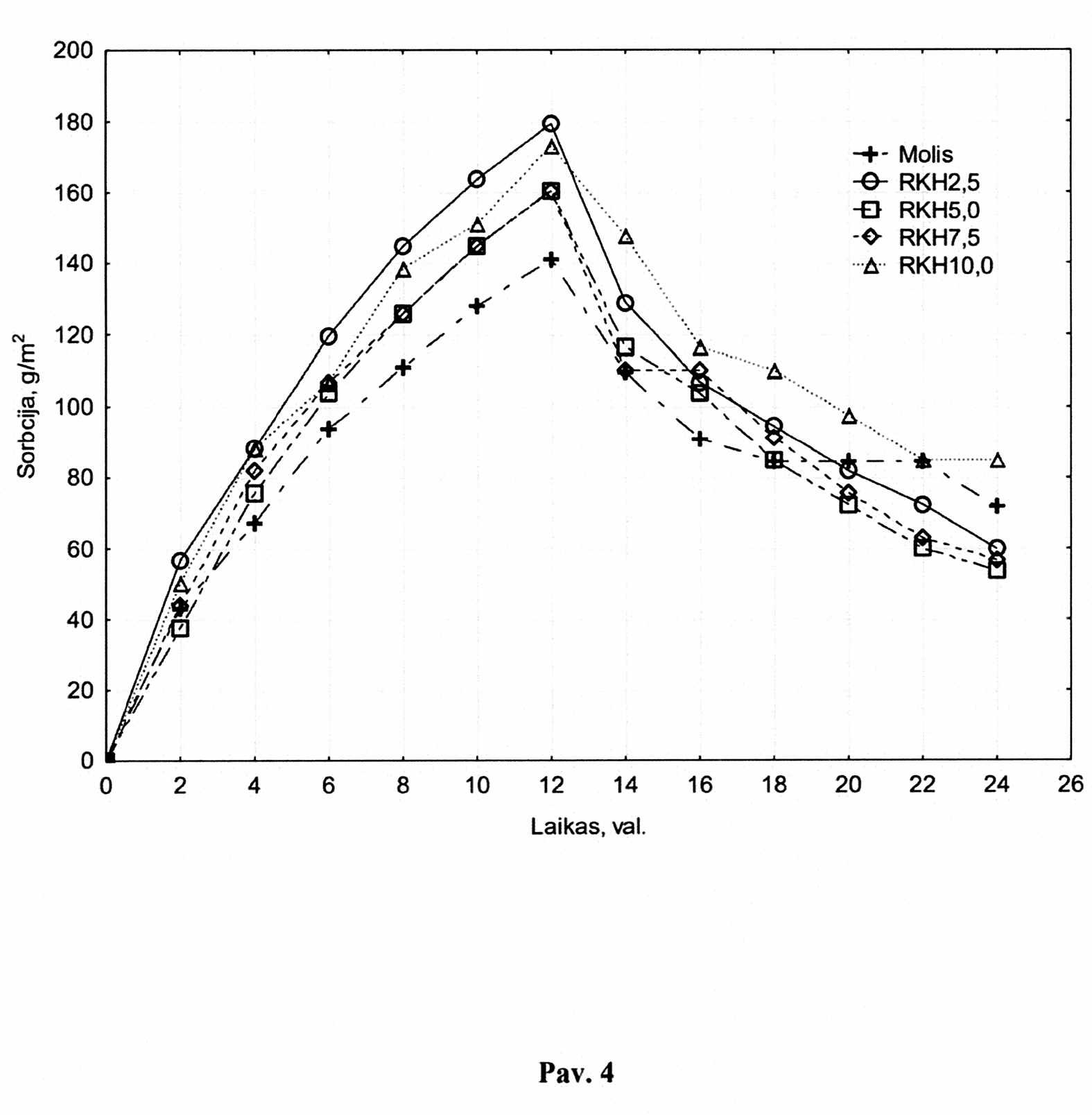 [0025] 4. pav. Drėgmės sorbcijos tyrimų rezultatai (RKH – retrograduoto krakmolo hidrogelis).