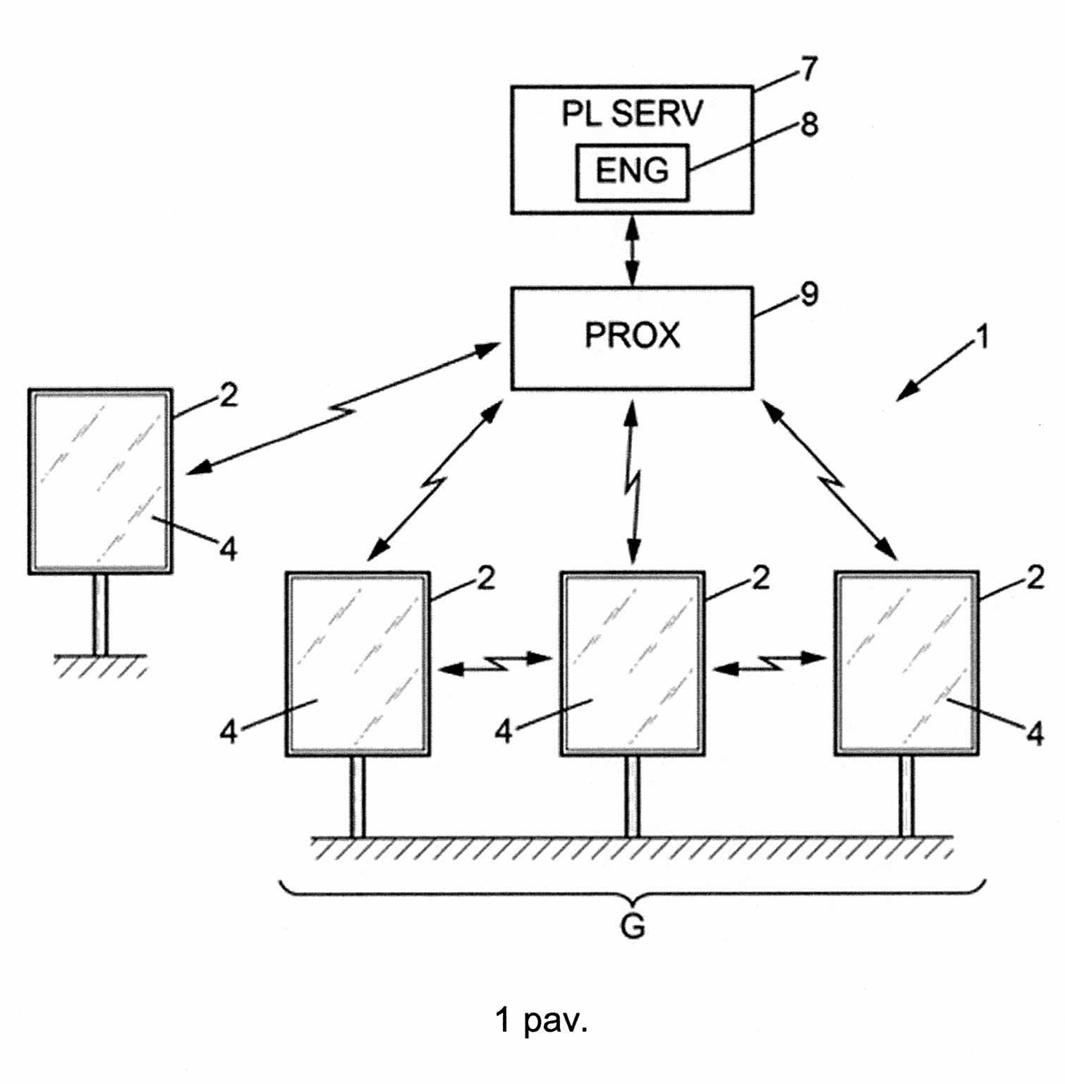 [0082] Be to, centrinė platforma 7 yra pritaikyta varikliu 8 nuolat atnaujinti minėtajai grupei G priklausančioje sistemoje esančių skaitmeninio vaizdavimo įrenginių 2 sąrašą, pavyzdžiui, pagal sistemos naudotojo vadovo 1 įvestas konfigūracijos modifikacijas.