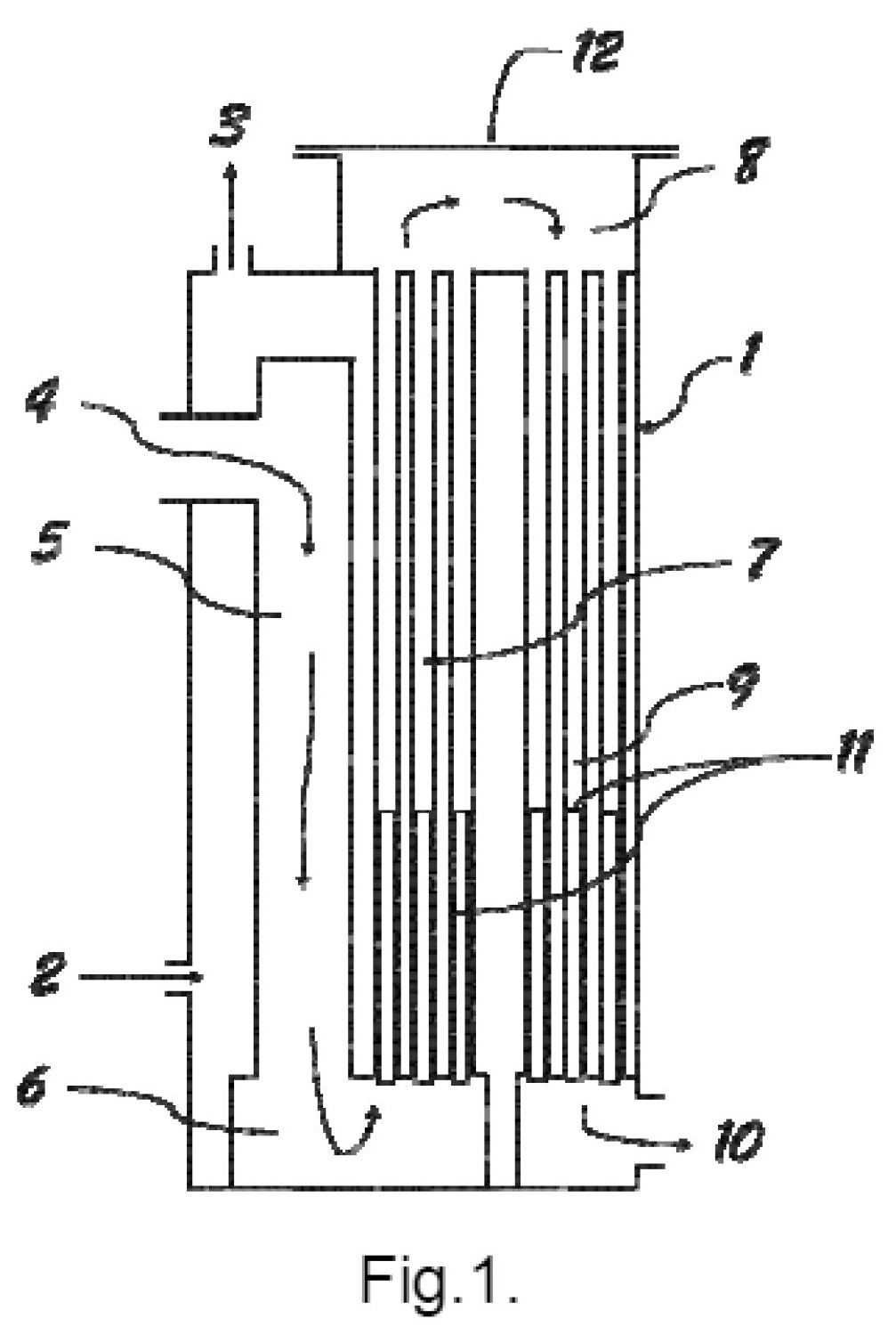 [0055] Fig. 1 pavaizduota šildymo katilo konstrukcinė schema su dūmavamzdžių apsauga nuo korozijos ir dilimo. Katilą sudaro katilo korpusas 1; vandens įtekėjimo į katilą atvamzdis 2; vandens ištekėjimo iš katilo atvamzdis 3; dūmų įtekėjimo į katilą atvamzdis 4; katilo kaitravamzdis 5; dūmų posūkio kamera 6, 8; pirmos eigos dūmavamzdžiai 7; antros eigos dūmavamzdžiai 9; dūmų ištekėjimo atvamzdis 10; vamzdžių įdėklai 11; katilo dangtis 12.