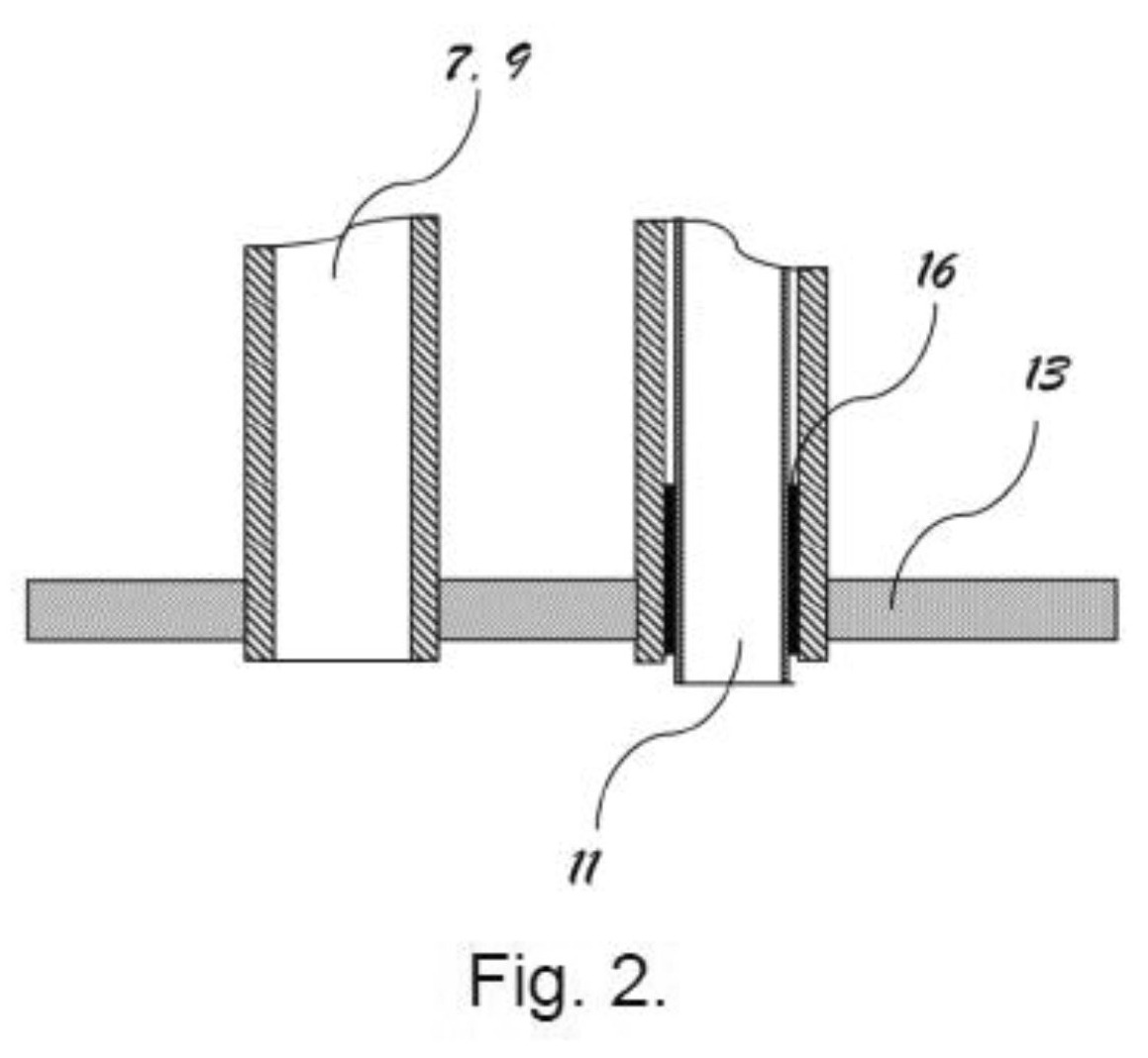 [0056] Fig. 2 pavaizduotas vamzdinio įdėklo tvirtinimas klijavimo būdu, kur į dūmavamzdžius 7 ir 9 įstatytas įdėklas 11 ir pritvirtintas prie dūmavamzdžių rėtinės13 klijų sluoksniu 16.