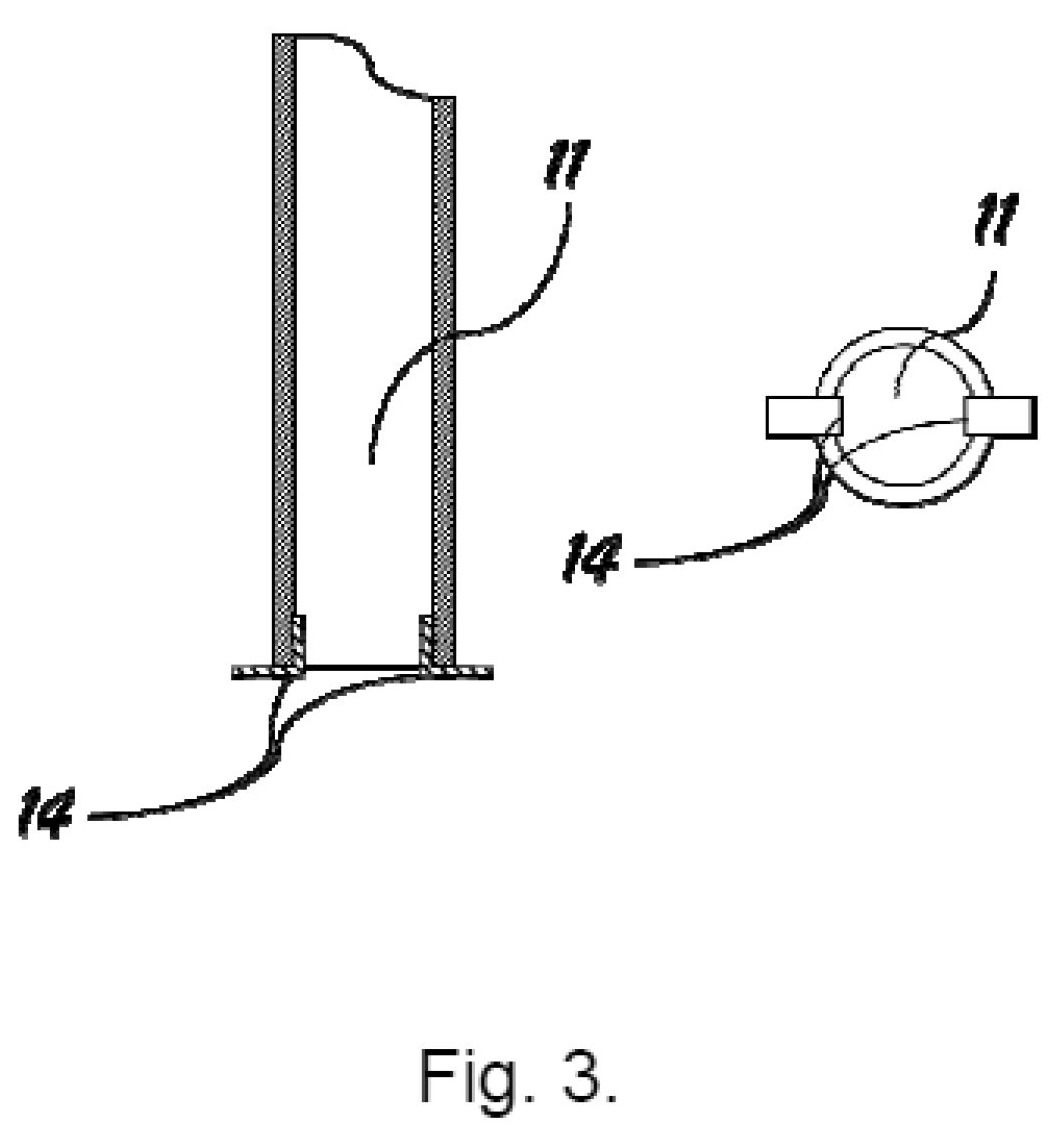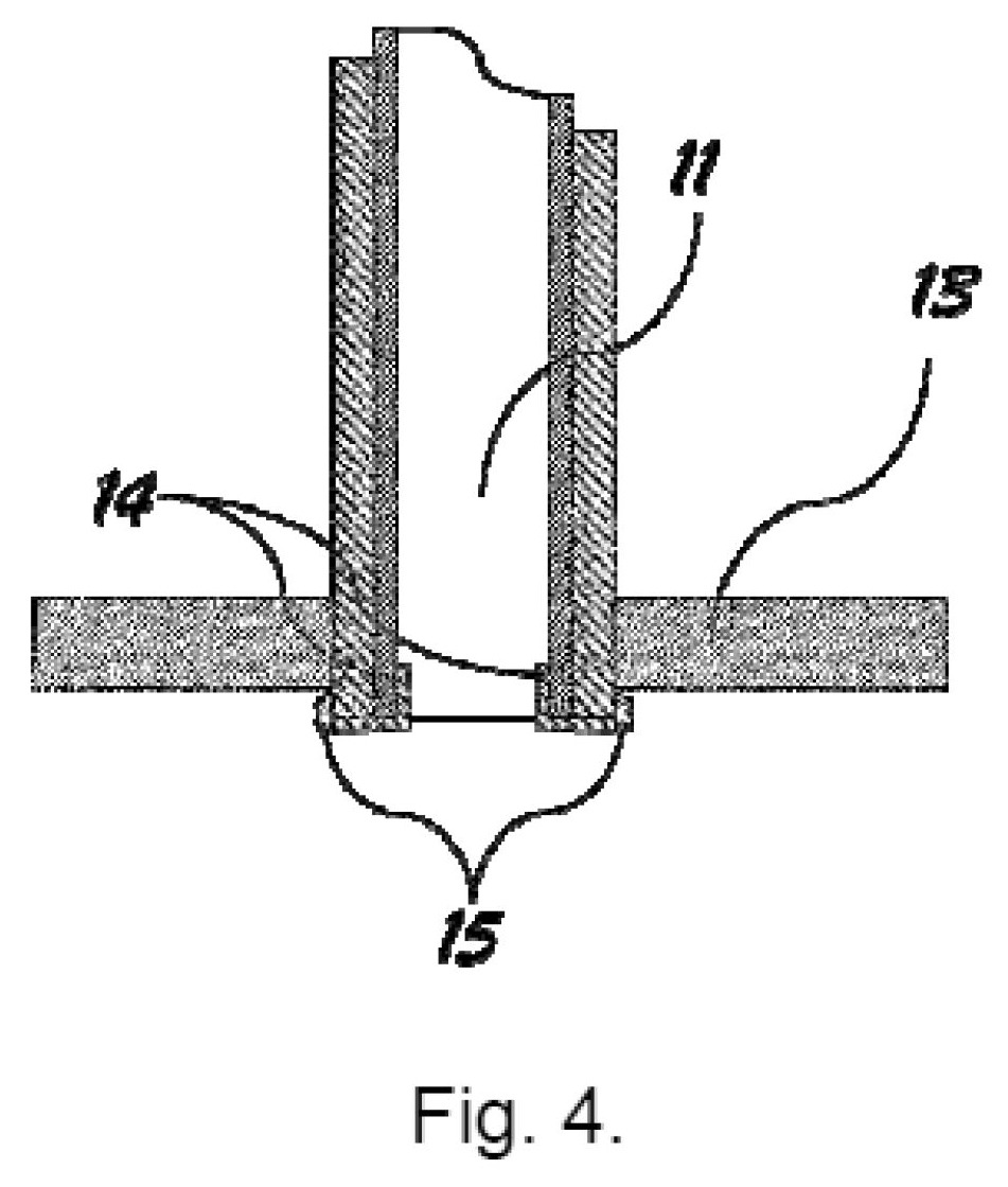 [0057] Fig. 3 pavaizduotas įdėklas 11, tvirtinamas įtvirtinimo detalėmis 14, kurios pritvirtinamos prie įdėklo privirinimo ar kitu būdu.