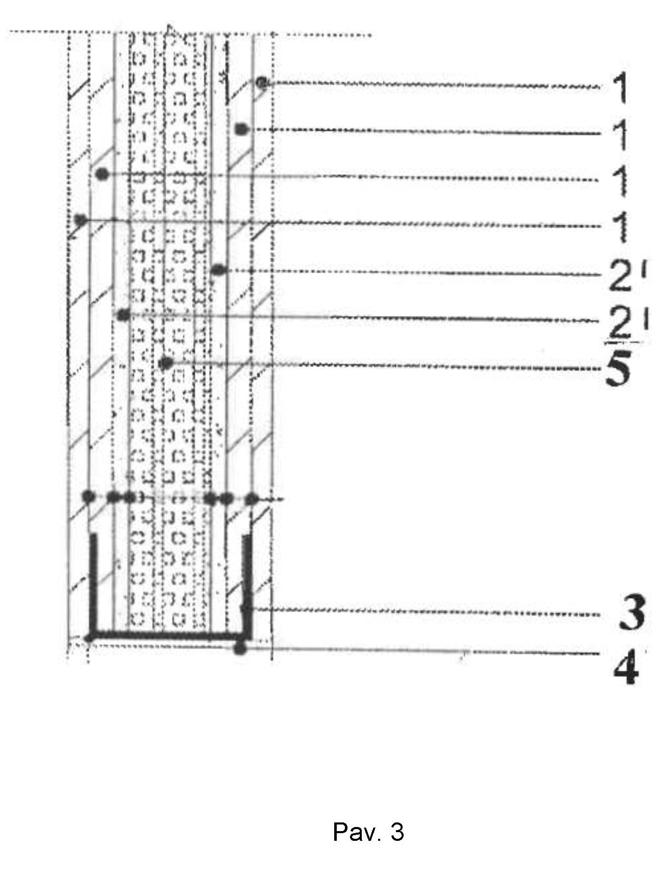[0021] Pertvara, pavaizduota 3 pav., susideda iš kiekviename pertvaros krašte esančių dviejų gipso kartono plokščių 1, Greta jų yra įtaisyta po vertikalią kraštinę garsą izoliuojančią plokštę 2' iš maltų naudotų padangų granulių. Pertvara sutvirtinta metaliniu profiliu 3. Ties apatiniu pertvaros pagrindu įtaisyta tarpinė 4 - horizontali garsą izoliuojanti plokštė iš maltų naudotų padangų granulių. Pertvaros viduryje tarp minėtų dviejų vertikalių kraštinių garsą izoliuojančių plokščių 2' iš maltų naudotų padangų granulių yra įrengta papildoma iš putų polistirolo pagaminta garsą ir (arba) šilumą izoliuojanti vertikali plokštė 5.