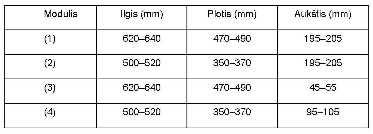 [0027] Kamino moduliai vienas nuo kito skiriasi pločiu, ilgiu ir aukščiu, taip pat dūmtraukio angos dydžiu: