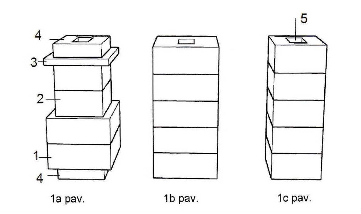 [0021] (1b) - (1c) paveiksluose pavaizduoti moduliniai kaminai su viena dūmtraukio anga, kuri yra vienos pilnavidurės plytos dydžio, kur visi kamino moduliai yra tik dideli arba tik maži, ir kai nenorima išsaugoti istorinės kamino išvaizdos; (2a) paveiksle pavaizduotas įvairių modulių dydžių modulinis kaminas su viena dūmtraukio anga, kuri yra dviejų pilnavidurių plytų dydžio (vadinamasis kaimo kaminas),