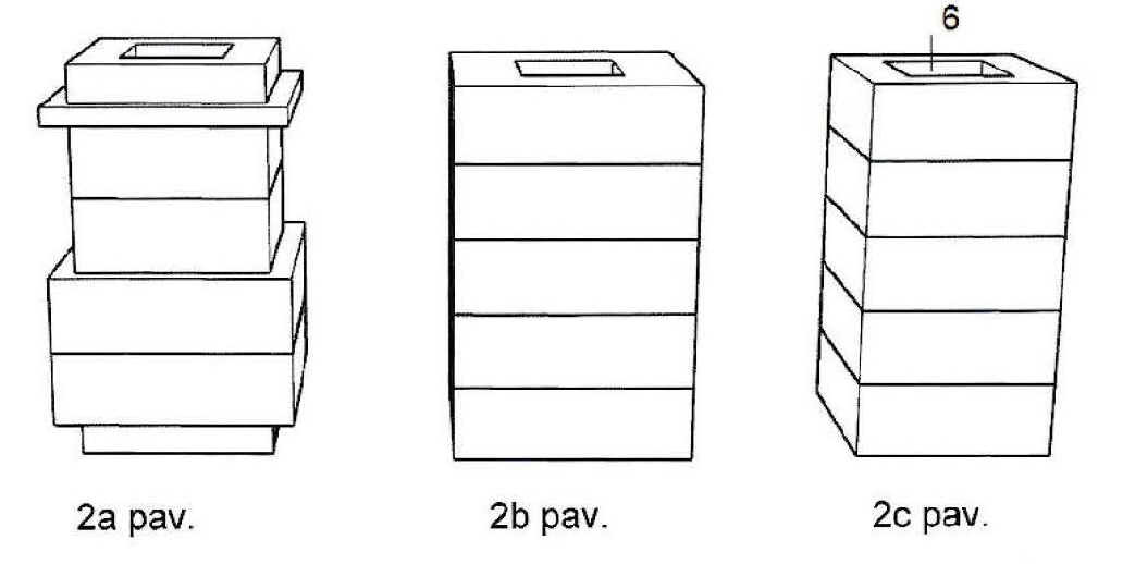 [0022] (2b) - (2c) paveiksluose pavaizduoti moduliniai kaminai su viena dūmtraukio anga, kuri yra dviejų pilnavidurių plytų dydžio, kur visi kamino moduliai gali būti tik dideli arba tik maži, ir kai nenorima išsaugoti istorinės kamino išvaizdos.