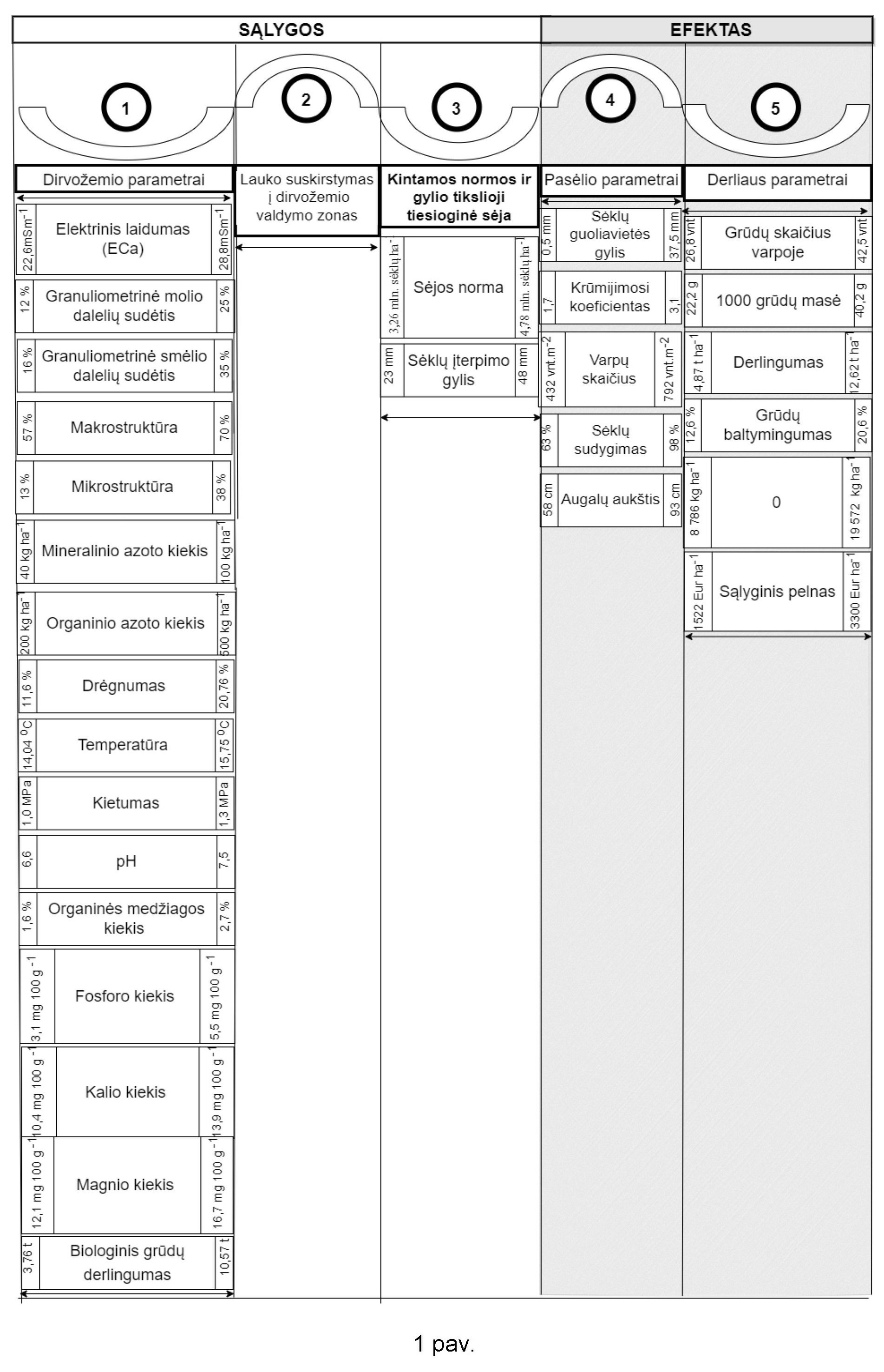 [0017] Tvarus tiksliosios tiesioginės žieminių kviečių sėjos technologijos valdymo modelis pagrįstas dirvožemio savybių priklausomybiniais tarpusavio ryšiais, kurie atliepia sėjos kintama norma ir kintamu gyliu efektyvumą gerinant sėklų guoliavietės kokybinius rodiklius, sėklų sudygimą, geresnį augalų vystymąsi, derlingumą, žieminių kviečių produktyvumą, kokybinius parametrus.