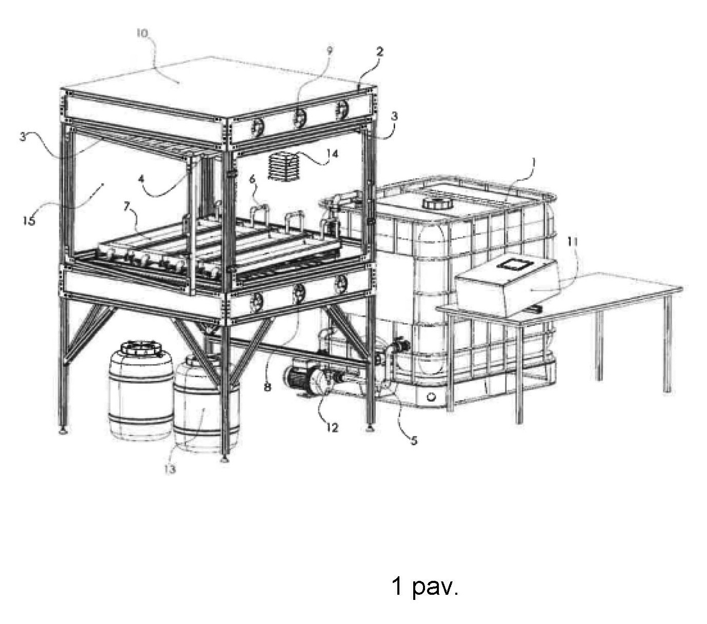 [0038] Žaliųjų pašarų, auginamų hidroponiniu būdu, proceso tyrimo stendą sudaro šios pagrindinės dalys (pav 1.): drėkinamojo tirpalo talpa 1; metalo profiliai 2 pagaminti ekstruzijos būdu iš aliuminio siekiant užtikrinti lengvą konstrukciją ir atsparumą korozijai; durys 3 skirtos patogiam stendo aptarnavimui su įrengtomis organinio stiklo plokštėmis 15; LED augalų apšvietimo sistema, kurią sudaro: LED valdiklis, esantis valdymo bloke 11 ir skirtas keisti apšvietimo intensyvumą bei fotoperiodo trukmę, aliuminio konstrukcijos juostos su jose įrengtais skirtingų spalvų LED diodais 4; drėkinamojo tirpalo tiekimo vamzdynas bei jungiamosios dalys 5 ir 6 skirtos tam, kad pagal poreikį būtų galima reguliuoti tekančio tirpalo slėgį bei srautą; auginimo lentynos mazgas su įrengta auginamų augalų masės kitimo stebėsenos sistema 7 (pav. 2.); įeinančio oro ventiliacijos sistema 8; išeinančio oro ventiliacijos sistema 9; plastikinės stendo dengiamosios plokštės 10; proceso valdymo blokas 11 su jame esančia įranga (kurią sudaro: autonominė, auginamų augalų masės matavimo įranga, žmogaus-mašinos sąsajos ekranas (angl. Human – machine interface HMI) skirtas supaprastinti svorio matavimo įrangos valdymą. Taip pat valdymo bloke įrengta maitinamojo tirpalo tiekimo valdymo įranga); drėkinamojo tirpalo tiekimo siurblys 12; sėklų mirkymo, laikymo talpa 13; matavimo blokas 14 su jame įrengtais šiais mikroklimato parametrų fiksavimo jutikliais: CO2 koncentracijos, temperatūros, santykinės oro drėgmės, šviesos srauto.