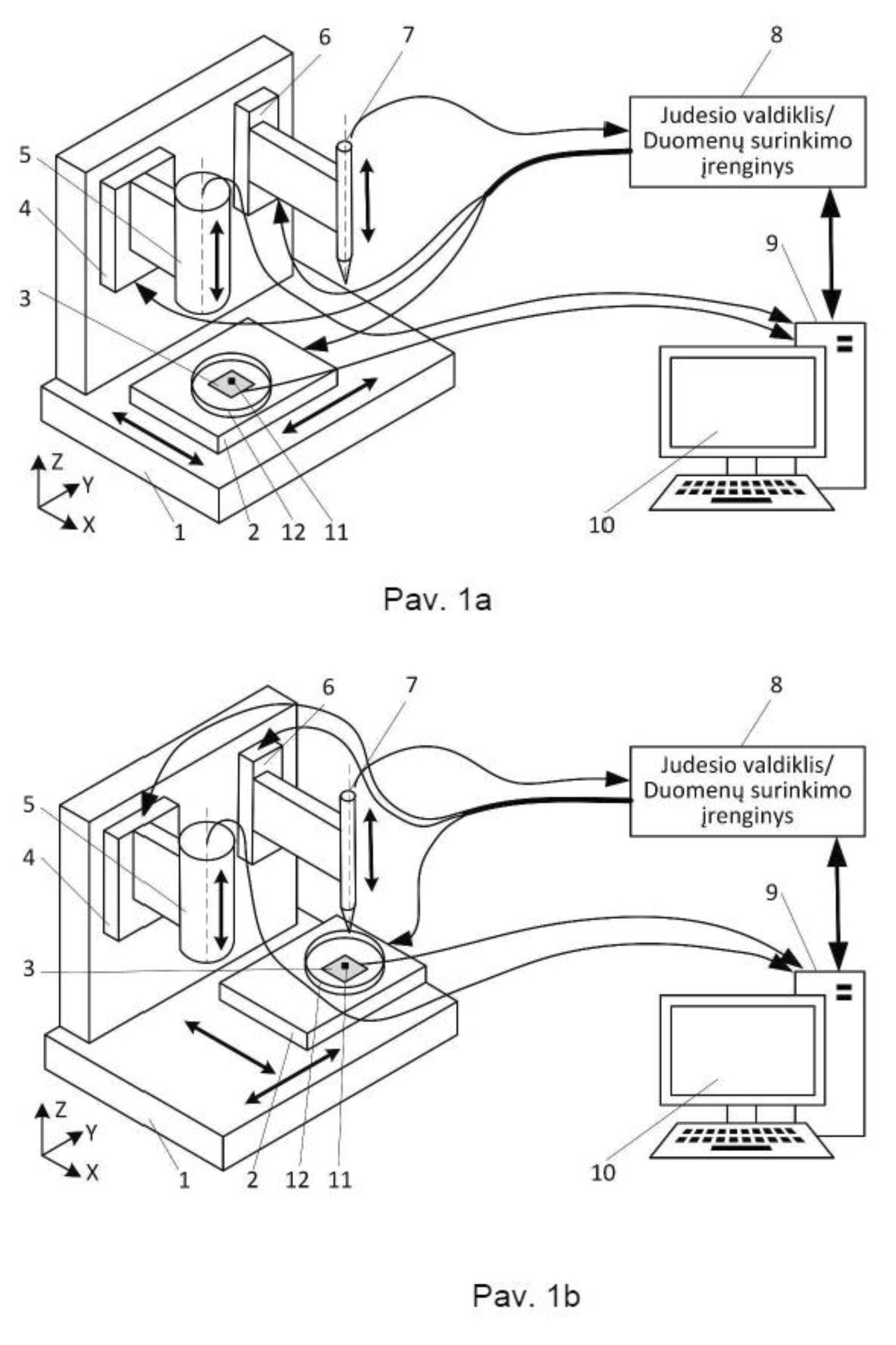 [0041] Tai pasiekiama naudojant mikroskopo kamerą, optinį jutiklį, pozicionavimo priemonę, susietą su žingsniniu varikliu kaip pavara, kurios išėjimo grandies padėtis yra žinoma pagal varikliui užduotų valdymo impulsų skaičių, bei ant vertikalios ašies sumontuotą elektrocheminių savybių matavimo elektrodą tiriamojo objekto paviršiaus tyrimui, nustatant jo aukštį. Mikrometrinio dydžio erdvinio objekto tyrimo sistema turi trijų ašių pozicionierių su papildoma vertikalia ašimi, skirta elektrocheminių savybių matavimo elektrodui, kuris leidžia nustatyti realų tiriamojo objekto dydį papildant optinį vaizdą realiomis koordinatėmis apskaičiuojamomis pagal užduodamus pozicionieriaus pavarų žingsninių variklių posūkių kampus.