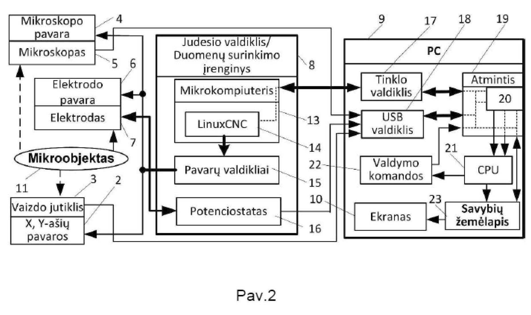 [0056] Atlikus vaizdų, gautų iš mikroskopo 5 ir jutiklio 3 analizę kompiuterio 9 procesoriuje yra suformuojamas valdymo komandų 22 rinkinys, pozicionierių 2, 4, 6 pavaroms bei potenciostatui 16, kuris yra įrašomas į atmintį. Potenciostato 16 valdymo komandos bei jo matavimo duomenys perduodami per USB valdiklį 18. Pavarų valdymo komandos per tinklo valdiklį 17 perduodamos į judesio valdymo bei duomenų surinkimo sistemą 8, kur mikrokompiuteris 13, naudodamas programinę įrangą LinuxCNC 14, paverčia jas fiziniais pavarų variklių valdymo signalais ir perduoda juos pavarų valdikliui 15, kur šie signalai yra atitinkamai moduliuojami ir perduodami pozicionavimo priemonių (2, 4, 6) pavaroms kaip maitinimo įtampa. Toliau pasirenkamas tiriamojo erdvinio mikroobjekto 11, elektrocheminio tyrimo režimas, nurodant prašomus skenavimo parametrus, matavimo taškų tankį ir kiekį bei skenavimo greitį, jeigu per tam tikrą laiką operatorius neišrenka mikroobjekto 11 arba nenurodo skenavimo parametrų, išsiunčiamas klaidos pranešimas ir procesas stabdomas. Kitame etape naudojant pozicionavimo priemonės 2 pavarą tiriamasis erdvinis mikroobjektas 11 perstumiamas taip, kad elektrocheminių savybių matavimo elektrodas 7 būtų virš tiriamojo erdvinio mikroobjekto 11 centro. Palaipsniui, su vertikalaus pozicionavimo priemonės 6 pavara, artinant elektrocheminių savybių matavimo elektrodą 7 prie tiriamojo mikroobjekto 11, atliekamas tiriamojo mikroobjekto 11 paviršiaus elektrocheminio aktyvumo matavimas, kurio metu nustatomas tikrasis mikroobjekto aukštis pasirinktame skenavimo taške.