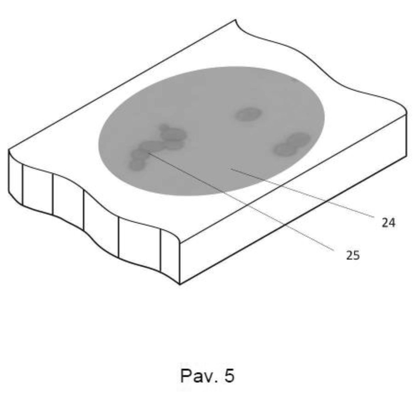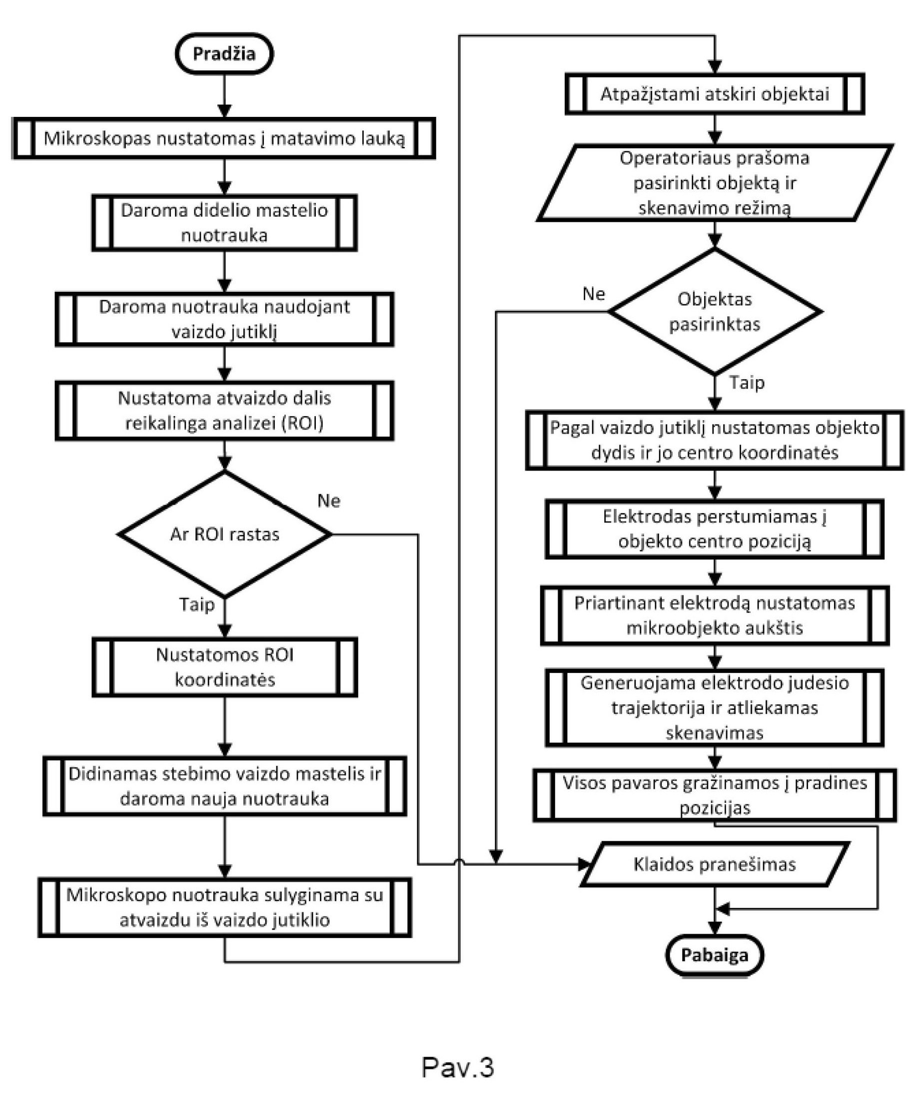 [0055] Tiriamo mikroobjekto matmenų ir paviršiaus reljefo nustatymo sistemos, kurios aparatūros sudėtis pateikiama Pav.1a, ir Pav.1b veikimo principas parodytas Pav. 2. Sistemos veikimas prasideda nuo tiriamojo objekto 11 pasirinkimo iš bandinio 24. Operatoriui pradėjus matavimą, pirmiausiai yra užduodamos komandos pozicionavimo priemonės 2 pavarai pozicionuoti bandinį 24 optinio mikroskopo 5 matavimo lauke. Naudojant vertikalaus pozicionavimo priemonės 4 pavarą sureguliuojamas fokusavimo atstumas ir padaroma bandinio 24 ploto nuotrauka. Kitame žingsnyje yra užfiksuojamas vaizdas iš apačios vaizdo jutikliu 3, kuriame matome realaus mastelio bandinio 24 šešėlį ir jo kontūrą. Gauti duomenys iš mikroskopo 5 ir jutiklio 3 perduodami į kompiuterio 9 atmintį 19 per USB valdiklį 18. Toliau gauti duomenys yra apdorojami centriniame procesoriuje CPU pagal algoritmą 20, kuris parodytas Pav. 3. Iš jutikliu 3 ir mikroskopu 5 užfiksuoto bandinio vaizdo (Pav.5) išskiriamos vietos kur matomos mikroobjektų sankaupos (dominančios sritys) 25. Jei mikroobjektų sankaupos neišskiriamos tada siunčiamas klaidos pranešimas ir procesas stabdomas, jei sankaupos aptinkamos, tuomet pasirenkama iš mikroobjektų sankaupų viena dominanti sankaupa 25 kaip tiriamasis erdvinis mikroobjektas 11. Naudojant pozicionavimo priemonės 2 pavarą tiriamasis erdvinis mikroobjektas 11 perstumiamas taip, kad mikroskopas 5 būtų virš pasirinkto tiriamojo erdvinio mikroobjekto 11 centro ir tuomet jis fotografuojamas mikroskopu 5, o pagal vaizdo jutiklio 3 duomenis, nustatomos pasirinkto tiriamojo mikroobjekto 11 kontūras (šešėlis) ir jo padėtis ROI koordinatėse (Region of interest - vietinės objekto aplinkos koordinatės).