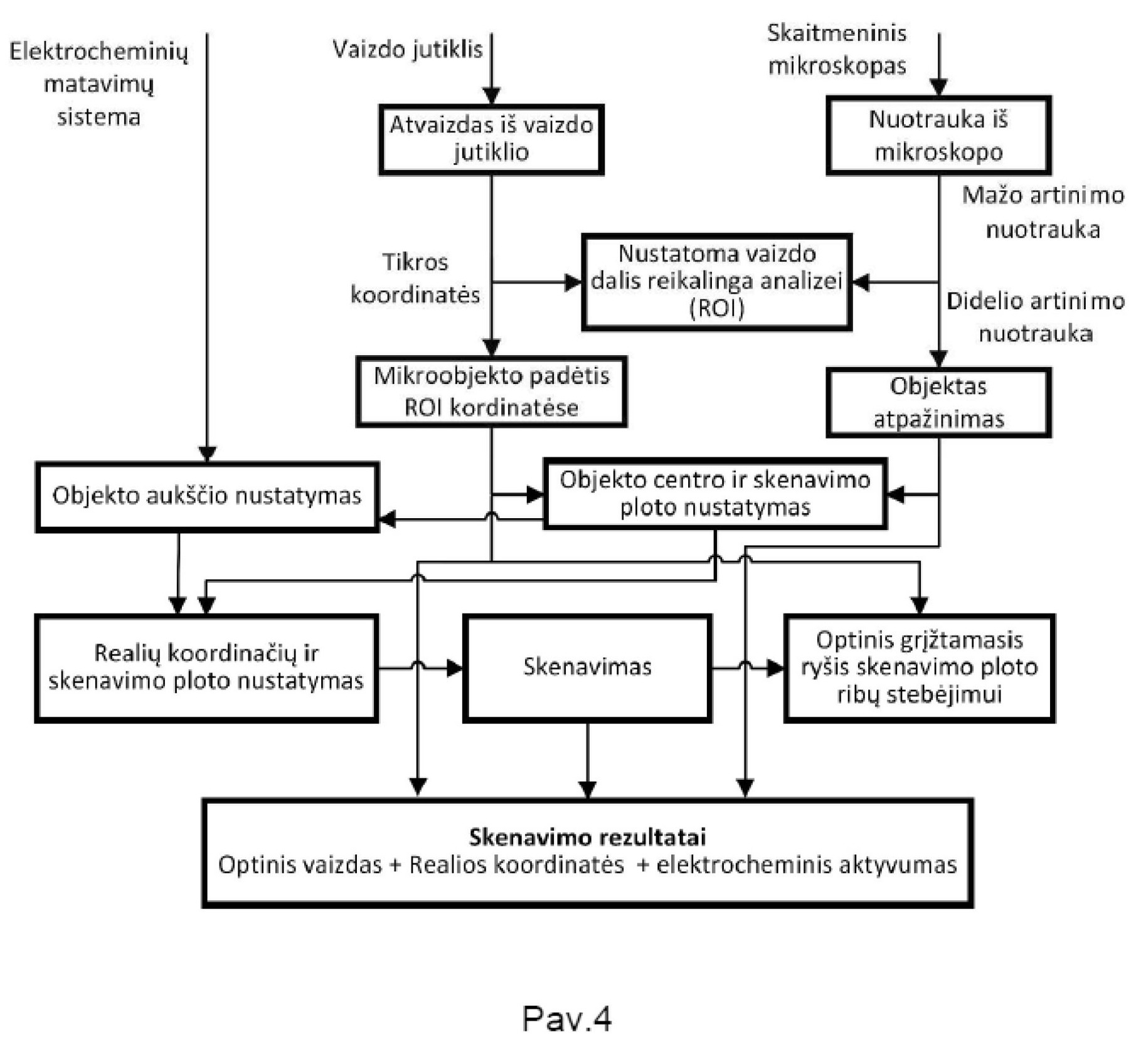 [0060] Mikroobjektų matmenų ir reljefo nustatymo sistemoje taikomas jutiklių (5, 3), pazicionavimo priemonių (2, 4, 6) koordinačių ir elektrocheminių matavimų sistemos (7, 16) duomenų suliejimo algoritmas parodytas Pav. 4. Duomenų suliejimas atliekamais keliais etapais, naudojant duomenis iš optinio mikroskopo 5, vaizdo jutiklio 3 bei elektrocheminių matavimų sistemos sudarytos iš elektrocheminių savybių matavimo elektrodo 7 ir potenciostato 16. Skenavimo metu vaizdo jutiklis 3 naudojamas, kaip grįžtamojo ryšio elementas, pagal jo duomenis yra koreguojama pozicionieriaus 2 pavaros eiga, užtikrinant, kad elektrodas 7 neišeitų už skenavimo zonos ribų.