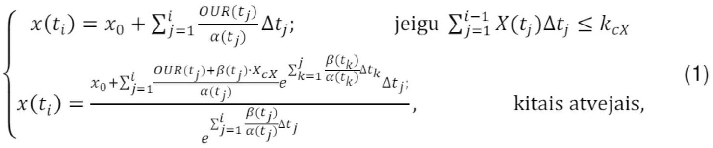 [0082] ● kiekvienam intervalui i*dt, skaičiuojama biomasės koncentracija x(i*dt), pagal (5) formulę;