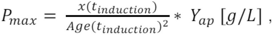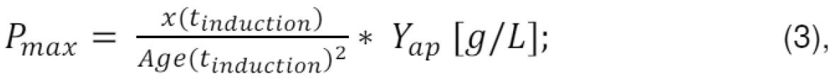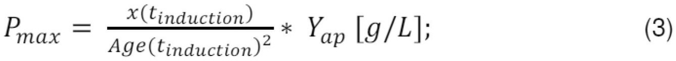 b) antrame žingsnyje (1.2), indukcijos momentu tinduction, pagal išmatuotą biomasės koncentraciją x(tinduction) ir įvertintą vidutinį amžių Age(tinduction), bei taikant eksperimentiškai identifikuotą produkto sintezės greičio dP(t)/dt priklausomybę nuo biomasės koncentracijos x(t) ir amžiaus Age(t), įvertinama tikėtinai maksimali tikslinio produkto koncentracija Pmax kultivavimo pabaigoje momentu tend;