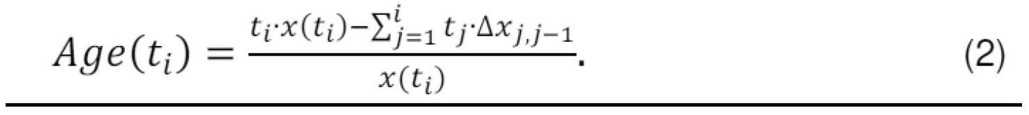 [0049] ● Bakterijų populiacijos vidutinis amžius (angl. Age) – vidutinis bakterijos gyvavimo laikas, nuo įvykusio bakterijos pasidalijimo iki analizuojamo momento (t). Iš esmės, jis priklauso nuo bakterijų specifinio augimo greičio µ;