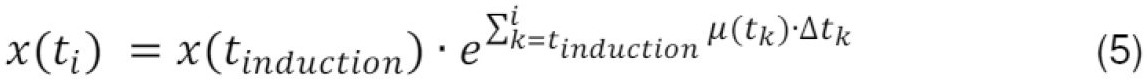 - skaičiuojama E.coli biomasės koncentracijos funkcija x(t), pagal formulę