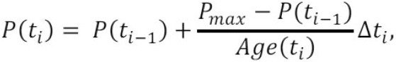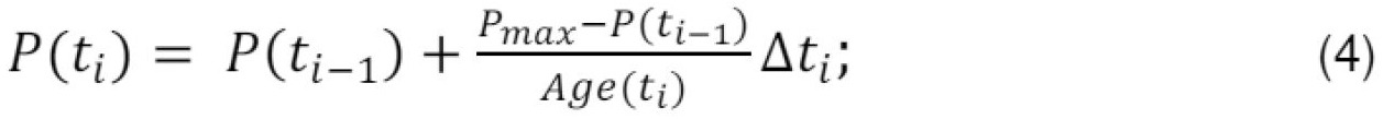 [0025] 3) Trečiajame žingsnyje, naudojant identifikuotą tikslinio produkto tikėtiną maksimalią koncentraciją Pmax, (3) išraiška, toliau, skaičiuojama tikslinio produkto koncentracijos funkcija P(t) poindukciniame kultivavimo laikotarpyje t=[tinduction; tend]. Produkto koncentracijos funkcijos P(t) formulėje pagrindiniai argumentai yra tikėtinai maksimali koncentracija Pmax ir bakterijų populiacijos vidutinis amžius Age(t), kur P(tinduction) = 0: