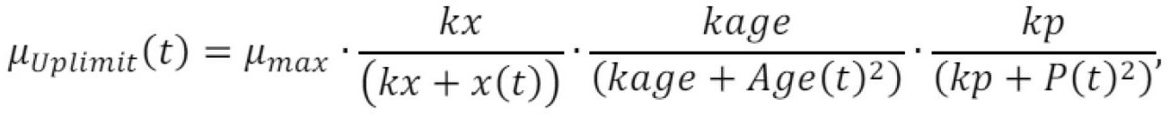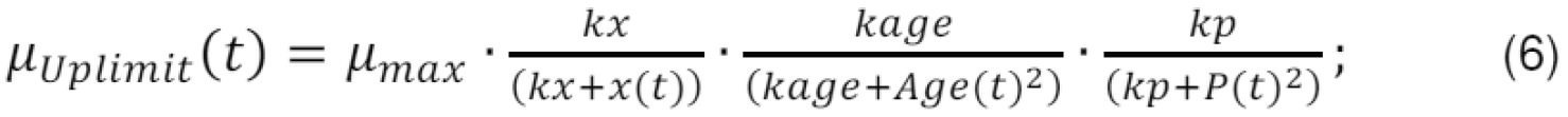 [0086] Visos optimizavimo procedūros metu optimizuoto specifinio augimo greičio profilio µ(i*dt), i=0..n praktinio panaudojimo galimybių užtikrinimui optimizavimo iteracinėje procedūroje taip pat vertinami papildomi maksimalaus leistino specifinio augimo greičio ribojimai. Kultivavimo procese maksimalus specifinis augimo greitis µ(i*dt), i=0..n priklauso nuo esamos biomasės koncentracijos x(t), bakterijų populiacijos vidutinio amžiaus Age(t) ir tikslinio produkto koncentracijos P(t). Todėl, iteracijų metu tos specifinio augimo greičio vertės µ(i*dt), i=0..n, yra atmetamos (nenaudojamos toliau maksimizuojant tikslinio produkto koncentraciją), kurios viršija (6) išraiškoje gautą vertę. Šis ribojimas E.coli kultivavimo procesams suformuojamas pagal modifikuotą Monod išraišką: