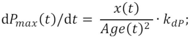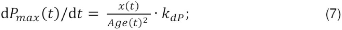 [0089] Iteracinėje optimizavimo procedūroje įvedamas ir tikslinio produkto maksimalaus sintezės greičio dP(t)/dt ribojimas. Tikslinio produkto koncentracija P(t), skaičiuojama pagal formulę (4), poindukcinio laikotarpio pradžioje. Dėl formulės (4) jautrumo kintamajam Age(t), produkto sintezės greičio dP(t)/dt reikšmes gali tapti didesnės, negu jos įmanomos realiuose kultivavimo procesuose ir eksperimentuose. Todėl, skaičiuojant sintezės greitį dP(t)/dt, laikoma, kad jo dydis neturėtų viršyti tam tikro maksimalaus greičio dPmax(t)/dt. Šis maksimalus greitis dPmax(t)/dt yra vertinamas empirine formule, suformuota remiantis kultivavimo eksperimentų duomenimis: