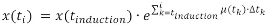 [0081] ● kiekvienam poindukcinio laikotarpio [tinduction; tend] diskrečiojo laiko intervalui i*dt,i=0..n specifinio augimo greičio µ(i*dt), i=0..n reikšmė didinama nuo esamos reikšmės (arba nuo 0 pradžioje) ją varijuojant (didininant iki 0,8 arba mažinant iki 0) su 0,01 specifinio augimo greičio pokyčio diskretiškumu;
