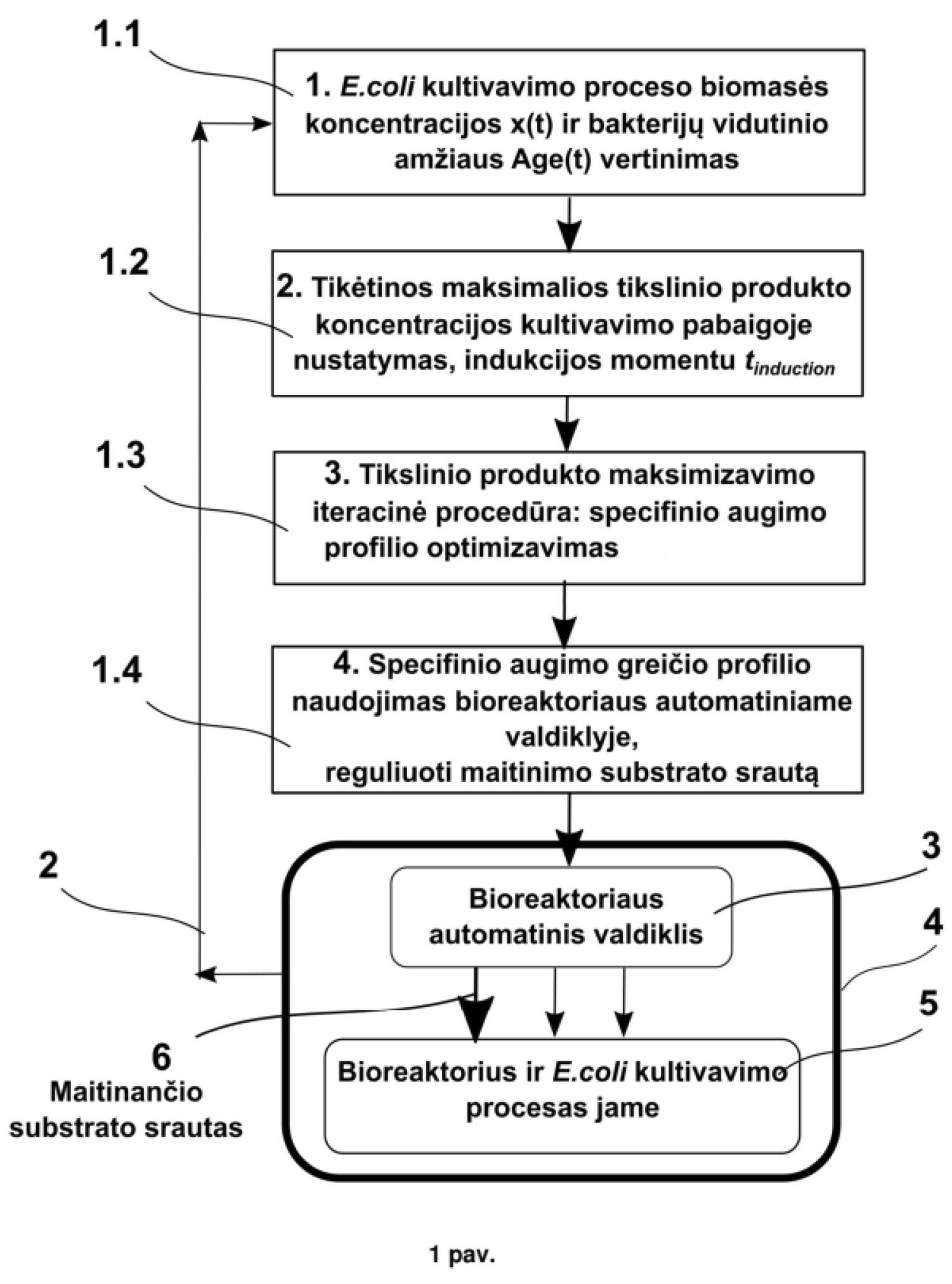 [0040] 1. pav.pavaizduoti žingsniai (1.1, 1.2, 1.3, 1.4) technologinio būdo, skirto maksimizuoti sintezuojamo tikslinio produkto koncentraciją rekombinantinių E.coli pusiau-periodiniuose kultivavimo procesuose (5): 6