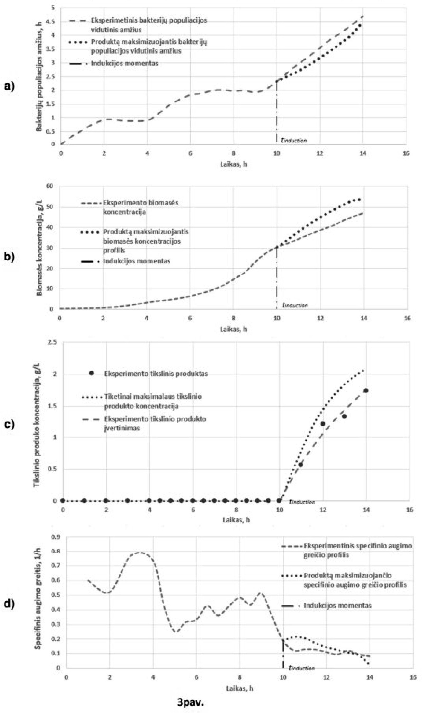 [0101] Inicijavus indukciją, nuo momento tinduction (3 paveiksle: 10-ta valanda), specifinis augimo greitis µ, yra surandamas pagal dviejų parametrų x(t) ir Age(t) funkcijos P(t) maksimumą, bei užtikrinant apribojimų neviršijimą pagal formules (6) ir (7). Atlikus indukciją, biomasės augimas sulėtėja bei didėja vidutinis bakterijų amžius. Realiai pasiektos kultivavimo charakteristikos skirsis nuo prognozuojamų pagal specifinius augimo profilius, šie skirtumai matosi taškinėse kreivėse 3 a pav. vidutinis populiacijos amžius, 3b pav. biomasės koncentracija, 3c pav. maksimaliai tikėtino produkto koncentracija, 3 d pav. specifinio augimo greitis.