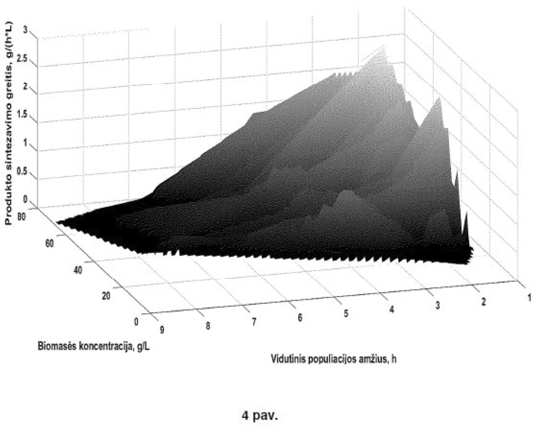 [0064] Antrajame būdo žingsnyje, įvertinama sintetinamo tikslinio produkto tikėtinai maksimali koncentracija Pmax kultivavimo proceso pabaigoje momentu tend, kuri priklauso nuo indukcijos momentu tinduction įvertintų: biomasės koncentracijos x(tinduction) ir populiacijos vidutinio amžiaus Age(tinduction). Atlikus kultivavimo eksperimentų duomenų analizę, pastebėta, kad kultivavimo proceso pabaigoje didžiausia tikslinio produkto koncentracija P(tend) gauta tuose kultivavimo eksperimentuose, kur E.coli vidutinis amžius Age(tinduction) indukcijos momentu buvo mažiausias ir biomasės koncentracija x(tinduction) didžiausia. Ši kompleksinė priklausomybė parodyta 4 paveiksle, kaip dviejų kintamųjų x(t) ir Age(t) 3D- funkcija, rodanti produkto sintezės greičio priklausomybę nuo šių dviejų faktorių. Pagal šiuos kultivavimo eksperimentų rezultatus, parengta formulė, leidžianti įvertinti tikėtiną maksimalią tikslinio produkto koncentraciją Pmax kultivavimo proceso pabaigoje (tai yra, P(tend))