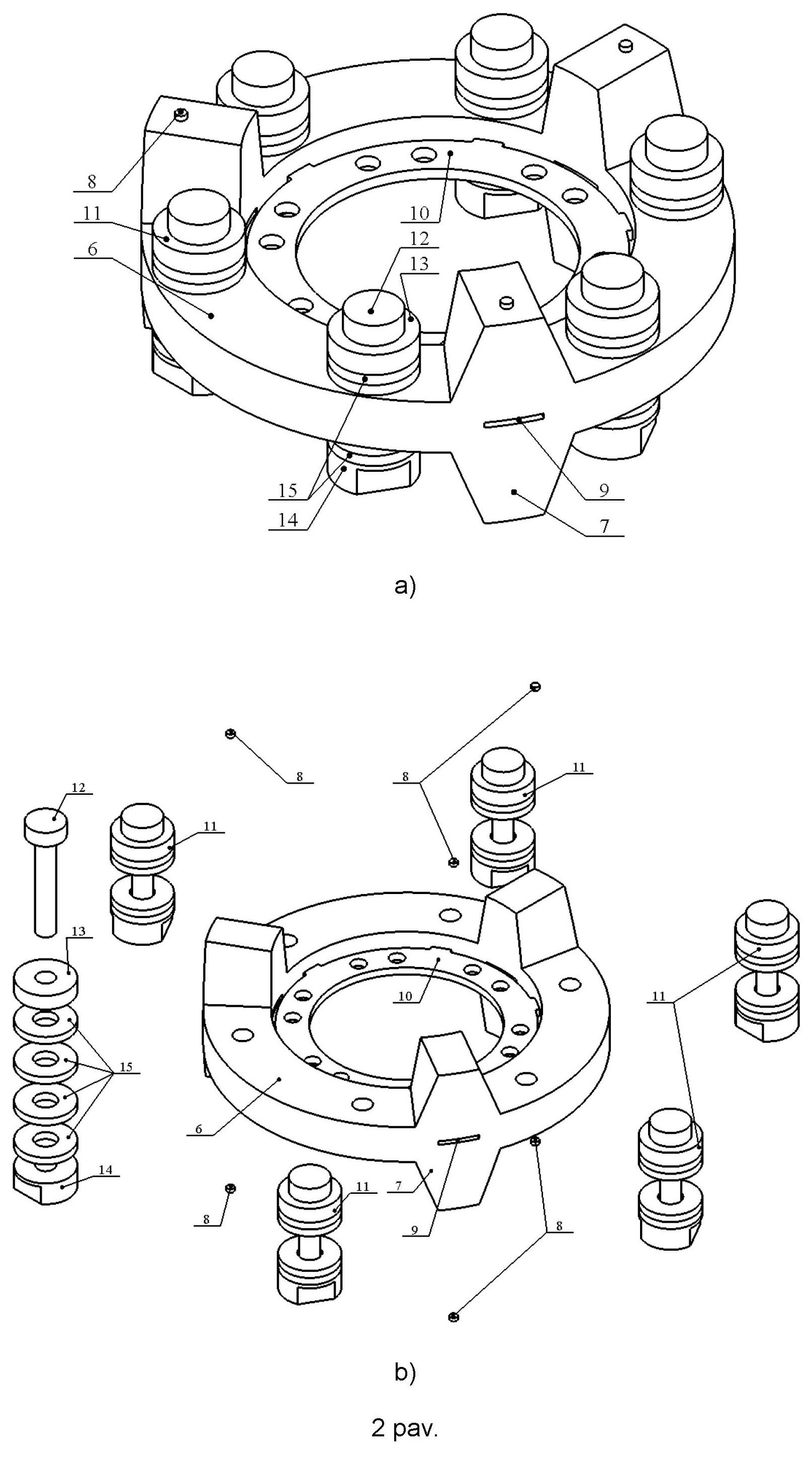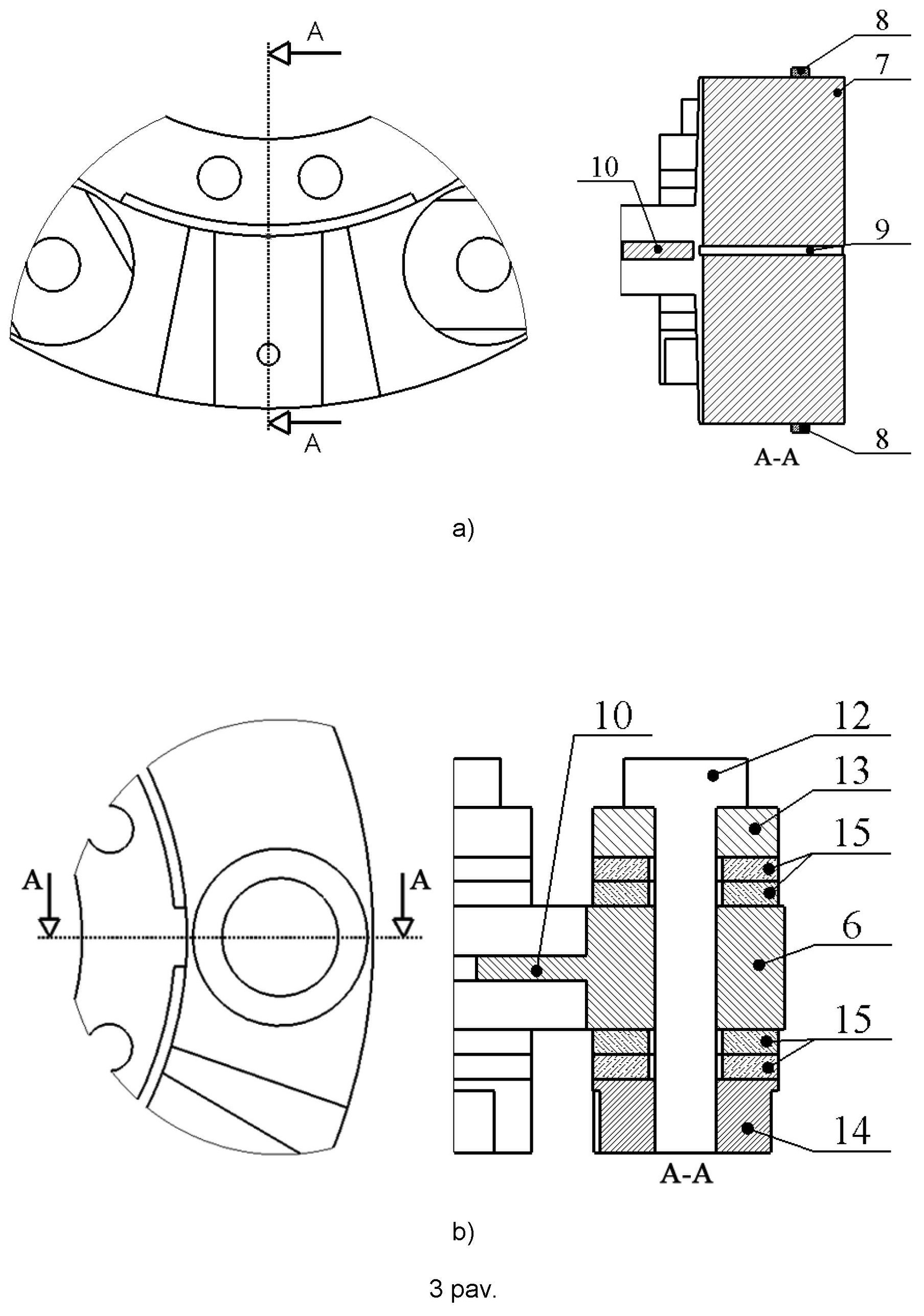 [0063] Variklio statorius (1) pavaroje įtvirtinamas naudojant statoriaus įtvirtinimo žiedą (10). Šis žiedas su statoriumi (1) sujungiamas neišardomai ir taip, kad įtvirtinimo žiedo (10) ir statoriaus (1) sujungimo vietos sutaptų su statoriuje (1) žadinamų išilginių virpesių mazginėmis zonomis. Žiedo formos statoriuje (1) taip pat įmontuojami pjezoelektriniai vykdikliai, pavyzdžiui, Lanževeno tipo paketai (11). Pjezoelektrinių vykdiklių išdėstymo pasiskirstymas žiede parenkamas taip, kad sutaptų su žiedo formos statoriuje (1) žadinamų išilginių virpesių mazgais. Lanževeno paketą (11) sudaro jo viršutinė dalis (13), pjezoelektriniai žiedai (15), apatinė dalis (14), ir paketo įtvirtinimo varžtas (12), kuris naudojamas išardomai pritvirtinti pjezoelektrinį Lanževeno tipo paketą (11) prie žiedinės formos statoriaus (1).