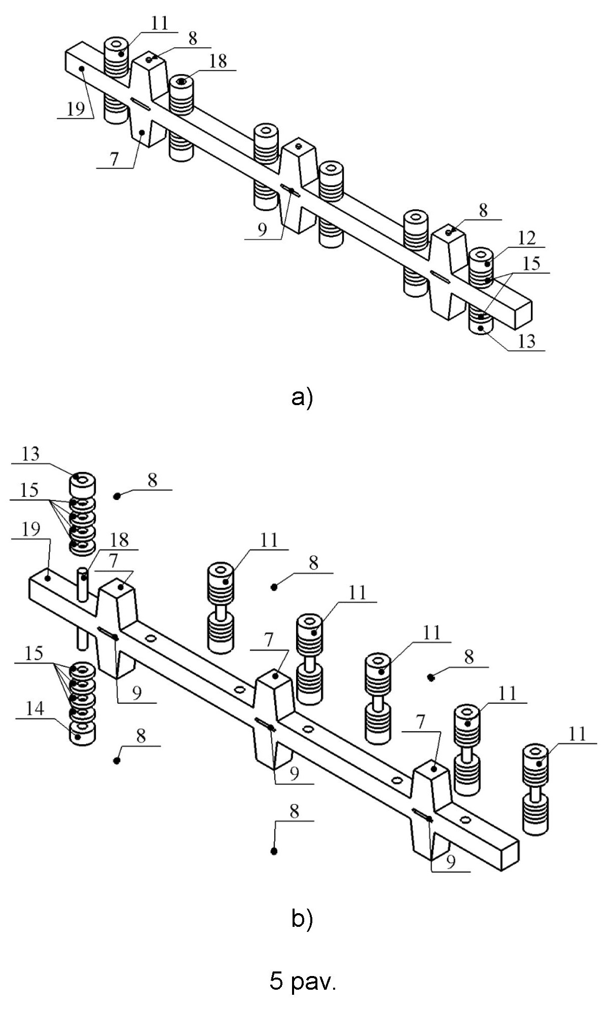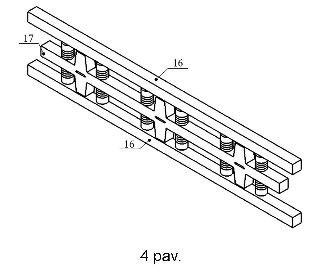 [0064] Linijinis variklis. Kitas galimas šio išradimo realizacijos variantas yra linijinis variklis. Linijinio variklio variante statorius (17) yra tampraus strypo formos, o vietoje disko formos dviejų rotorių (2) naudojami tiesiniai slankikliai (16). Taip pat, varžtas (12) gali būti pakeičiamas smeige (18). Tuo tarpu, aukščiau aprašyti trapecinių dvipusių dantų (7) ir pjezoelektrinių Lanževeno paketų (11) konstrukcija ir montavimo principai išlaikomi tie patys, kaip ir rotacinio variklio konstrukcijoje. Šis linijinis variklis formuoja slenkamąjį judesį.