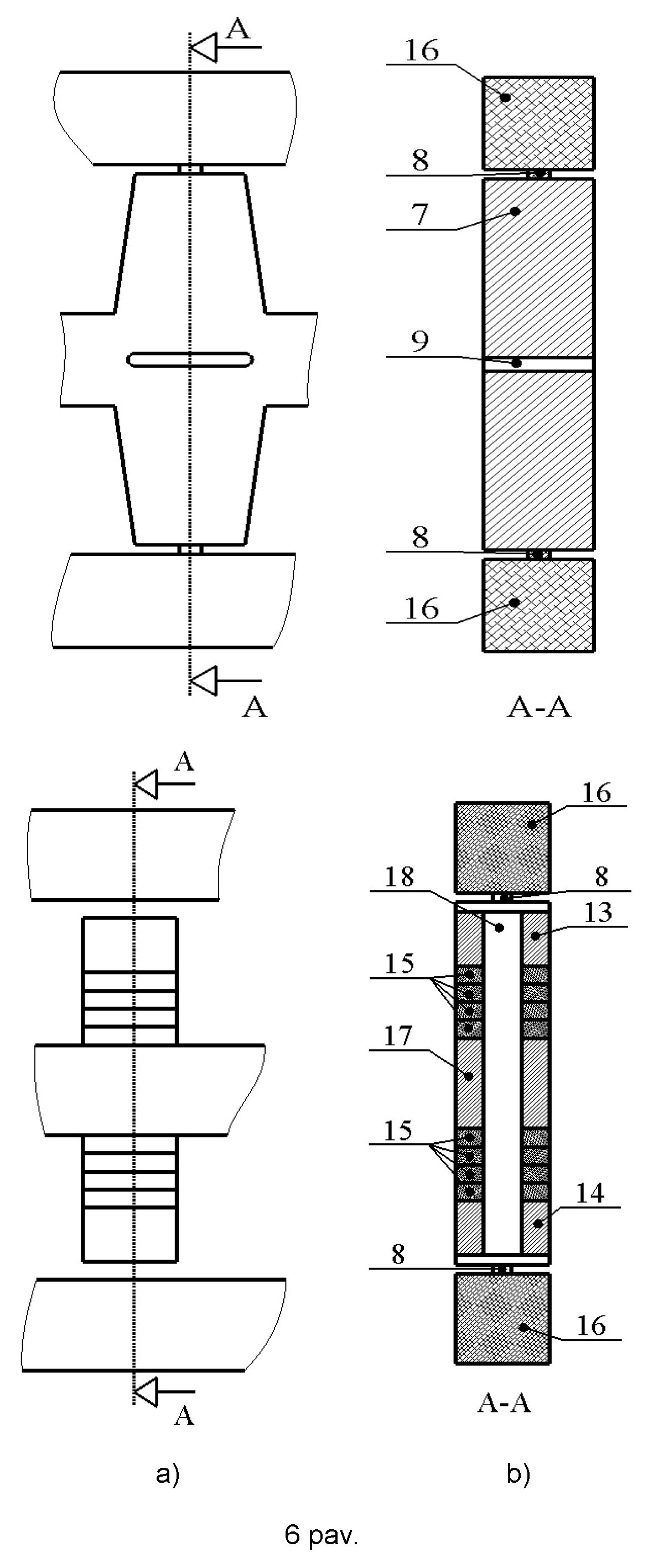 [0025] 6 pav.Pjezoelektrinio slenkamojo judesio variklio danties ir pjezoelektrinio paketo konstrukcijų detalizacija: (a) – danties konstrukcijos detalizacija; (b) – pjezoelektrinio Lanževeno tipo paketo konstrukcijos detalizacija.