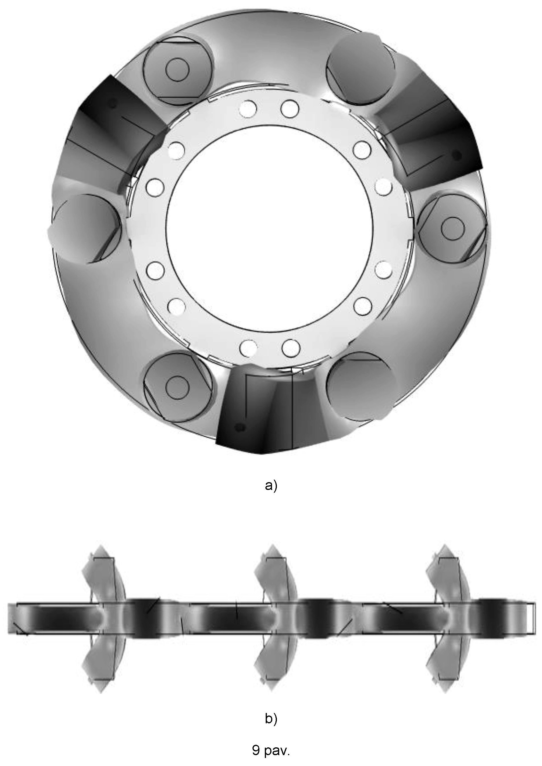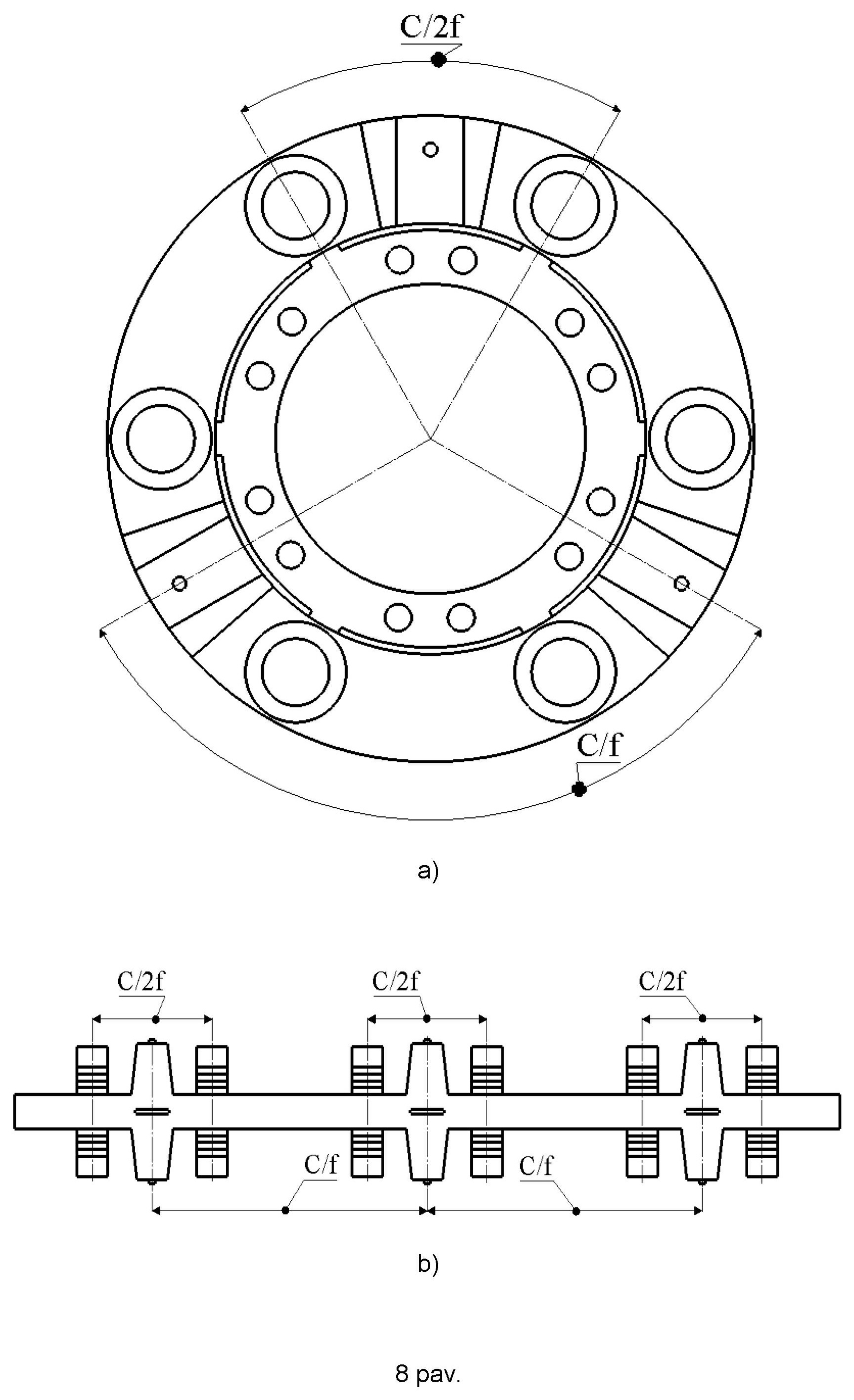 [0027] 8 pav.Trapecinių dvipusių dantų ir pjezoelektrinių paketų pasiskirstymo schema: (a) – sukamojo judesio pavaroje; (b) – slenkamojo judesio pavaroje.