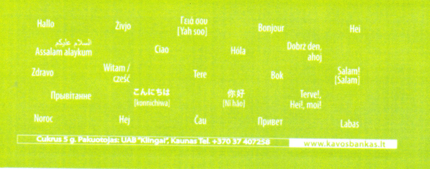 | (540) | Labas Privet Čau Hallo Vitam Zdravo Salam Hej Bonjour Assalam alaykum Tere Bok Živjo | |