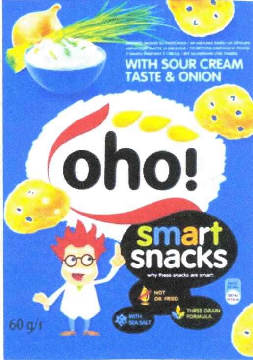| (540) | WITH SOUR CREAM TASTE & ONION oho! smart snacks why these snacks are smart NOT OIL FRIED WITH SEA SALT THREE GRAIN FORMULA | |