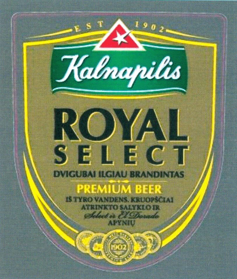 | (540) | EST 1902 Kalnapilis ROYAL SELECT DVIGUBAI ILGIAU BRANDINTAS PREMIUM BEER IŠ TYRO VANDENS. KRUOPŠČIAI ATRINKTO SALYKLO IR APYNIŲ | |